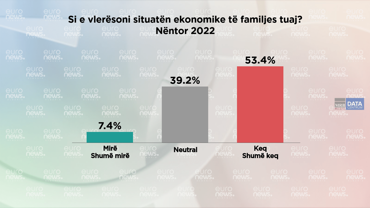 53.4% e shqiptarëve tregojnë se situata ekonomike në familjet e tyre në muajin nëntor 2022 është përkeqësuar. 39.2% e tyre janë neutral dhe vetëm 7.4% e tyre kanë gjendje më të mirë ekonomike.