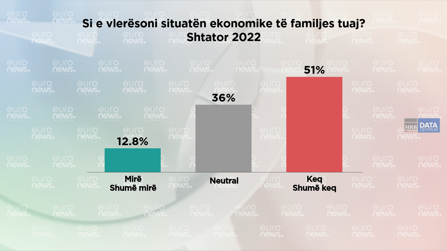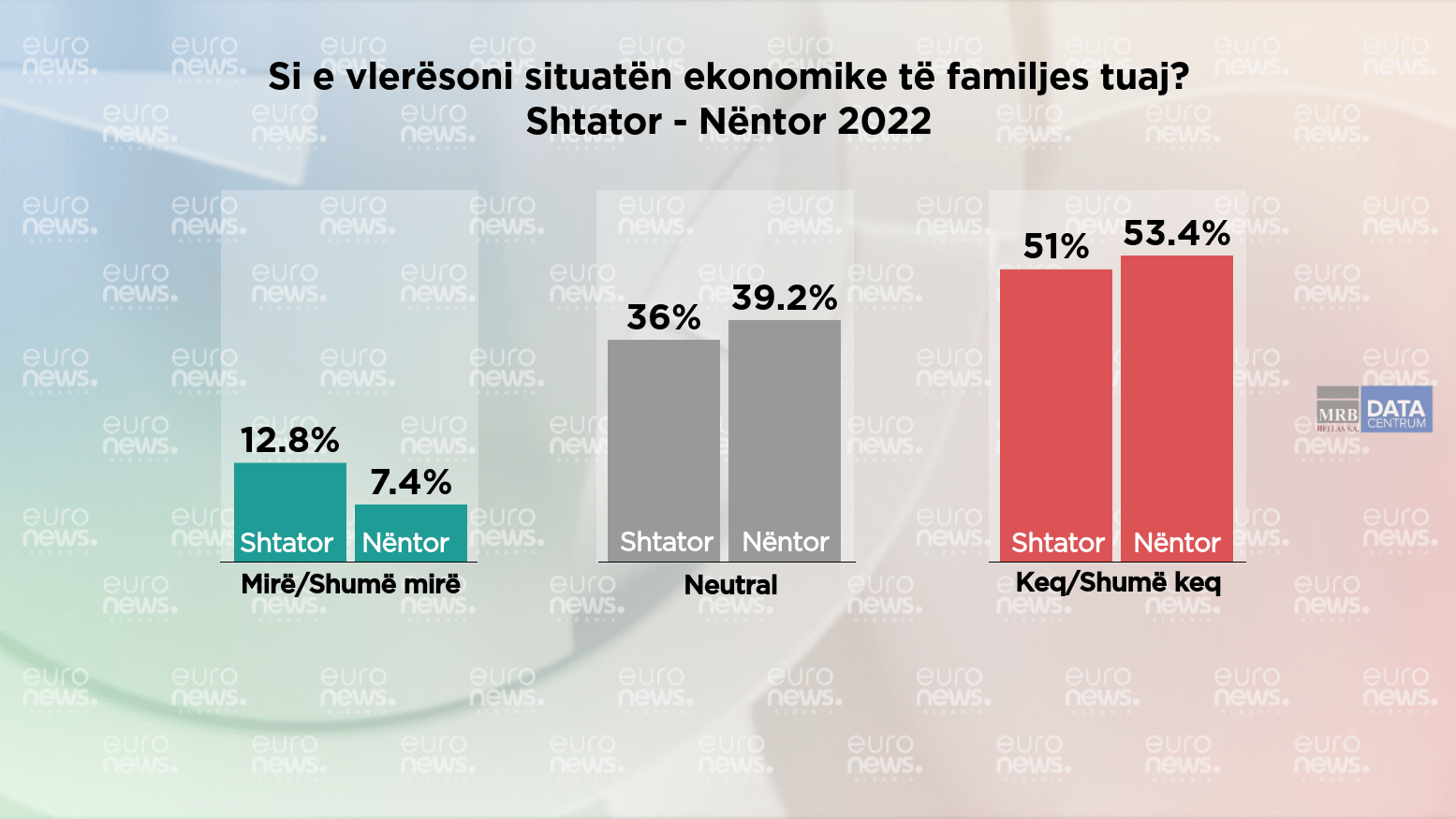 Situata vetëm është përkeqësuar krahasuar me muajin shtator, kur 51% e shqiptarëve janë shprehur se ekonomia e tyre familjare është përkeqësuar në muajin shtatorë 2022, pra 2.4% më pak se në muajin tetor. Ndërkohë që për muaj shtator 36% kanë qenë neutral, 3.2% më pak se në tetor dhe 12.8% janë shprehur se gjendja e tyre ekonomike është më e mirë, 5,4% më shumë se në tetor.