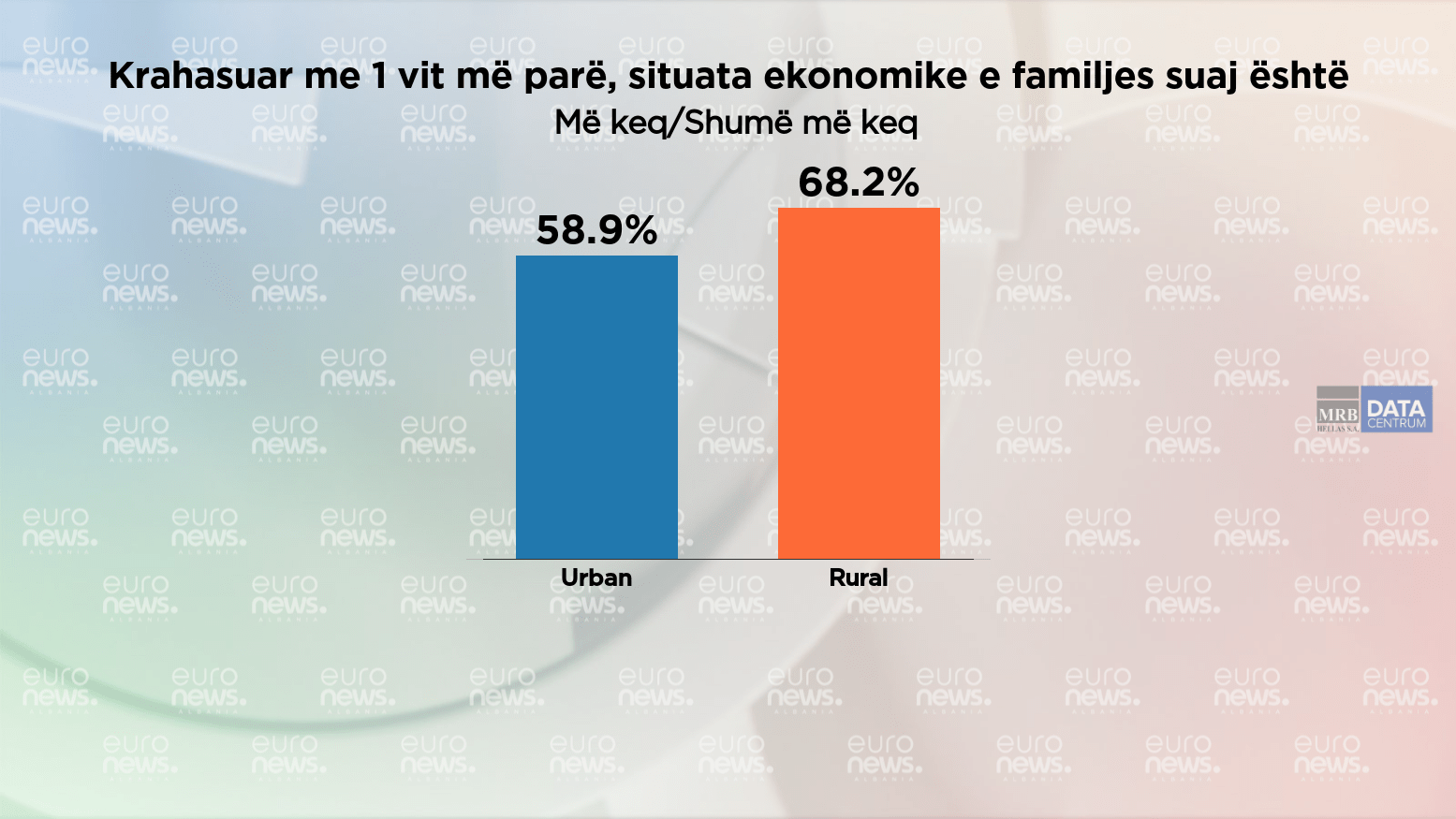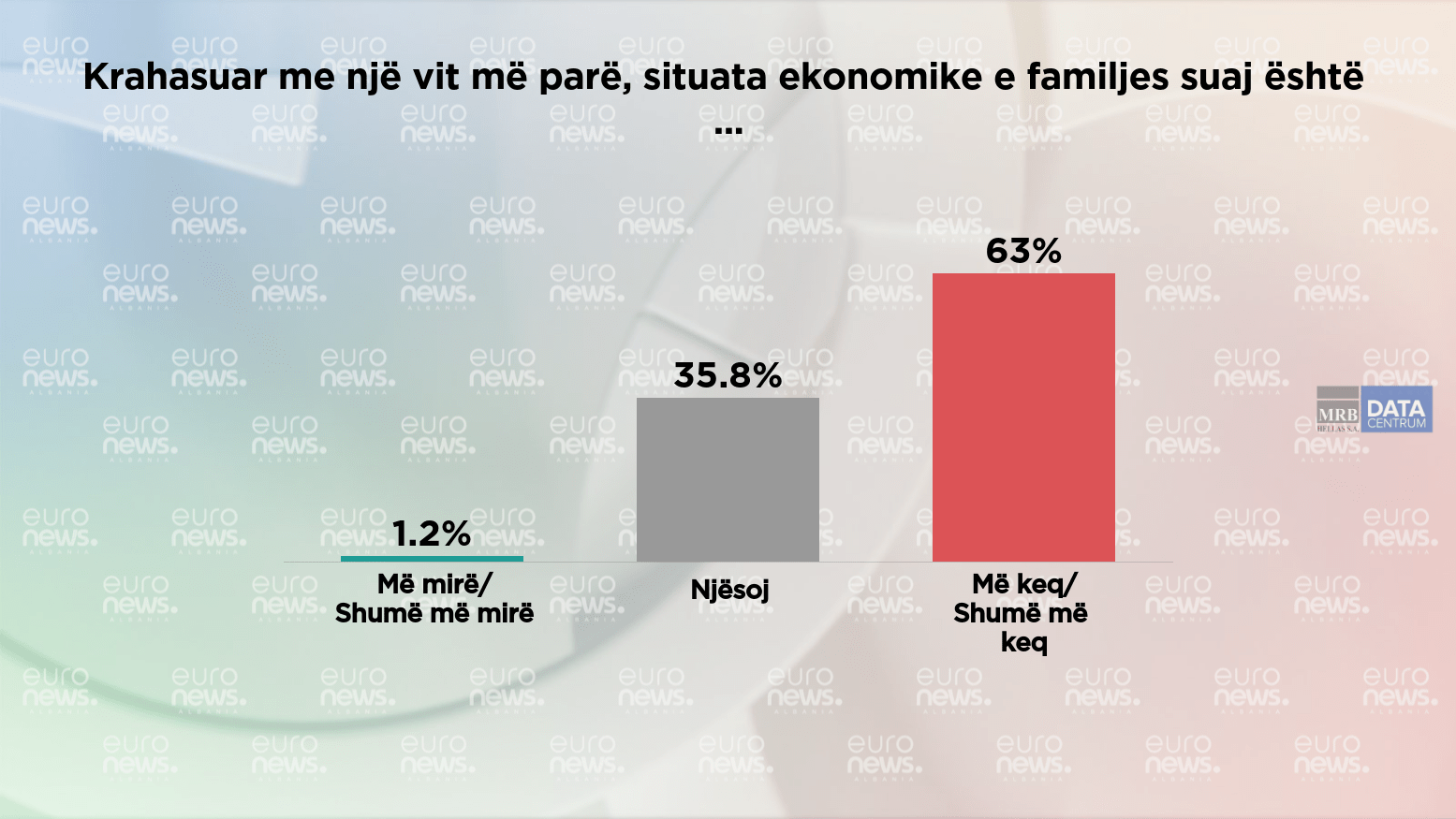 Krahasuar me një vit më parë, 63% e shqiptarëve kanë treguar se situata ekonomike në familjet e tyre është më e keqe. 35.8% janë shprehur se situata ekonomike në familjet e tyre krahasuar me një vit më parë është neutrale dhe vetëm 1.2% kanë një gjendje më të mirë ekonomike se një vit më parë.