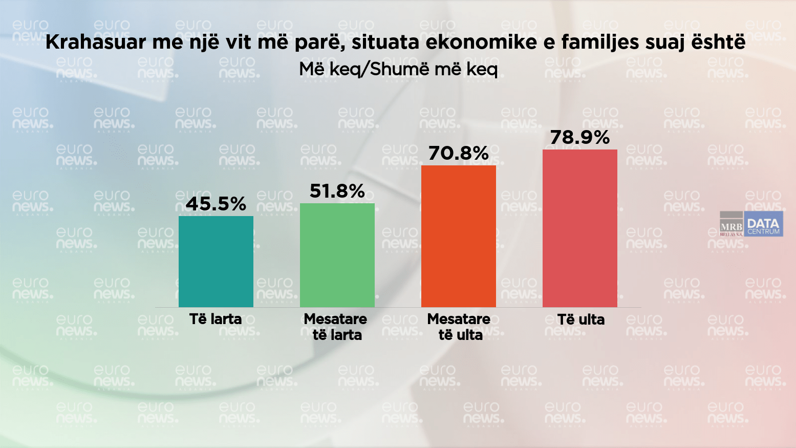 Rritja e çmimeve nuk ka prekur vetëm shtresat e varfër. Nga ata që janë shprehur se situata e tyre ekonomike është me e keqe se një vit më parë, 78.9% e tyre janë me të ardhura të ulëta, 70.8% janë me të ardhura mesatare, 51.8% me të ardhura mesatarisht të larta dhe 45.5% janë me të ardhura të larta.