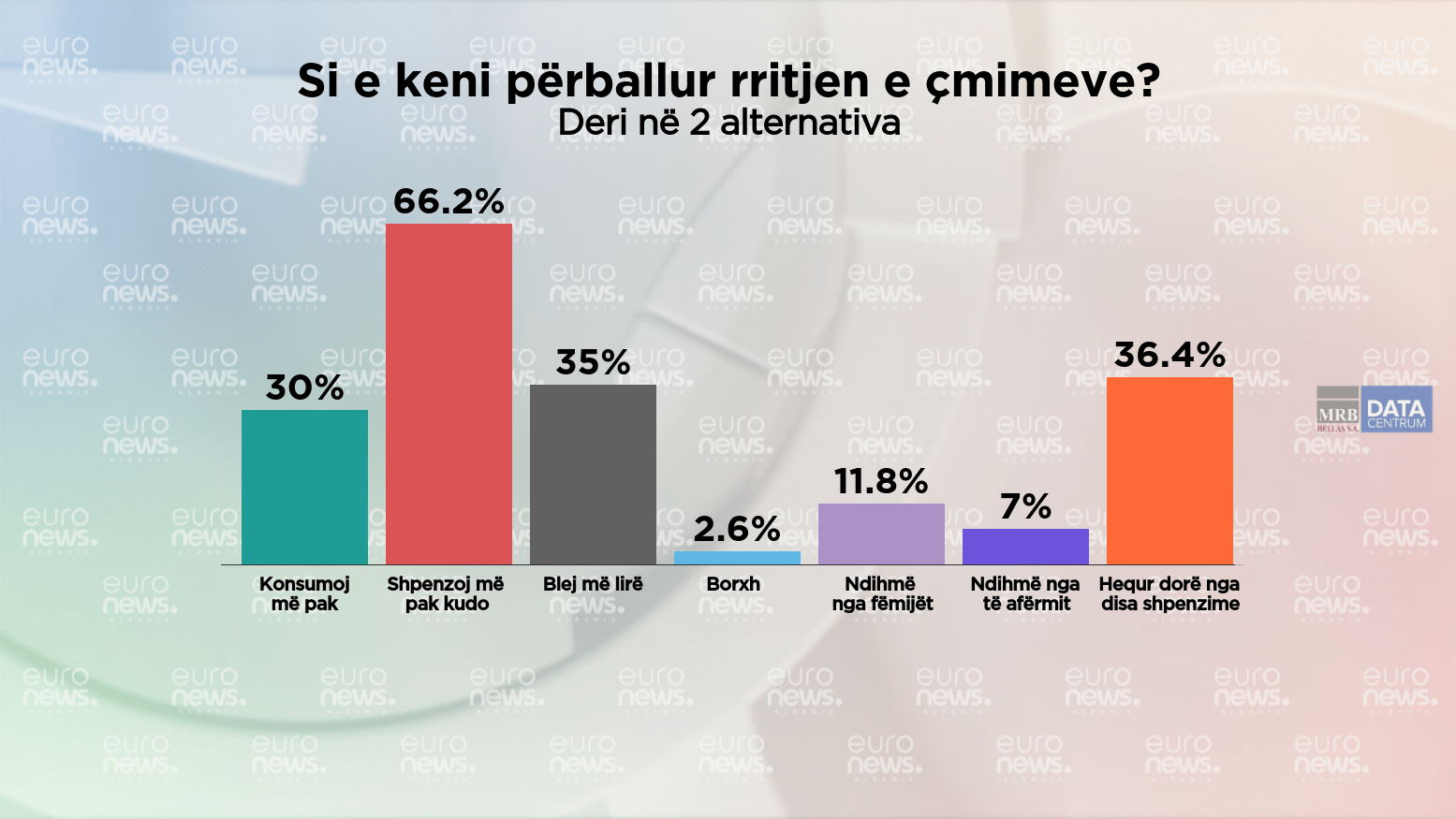 Për të përballuar krizën, 66.2% e shqiptarëve shpenzojnë më pak kudo. 36.4% e tyre kanë hequr dorë nga disa shpenzime, 35% e tyre blejnë më lirë dhe 30% e tyre konsumojnë më pak. Por ka edhe nga ata të cilët kanë kërkuar ndihmën e fëmijëve për t’u përballur me krizën dhe janë 11.8%, ndërsa 7% kanë kërkuar ndihmën e të afërmeve dhe 2.6% kanë marrë borxh.