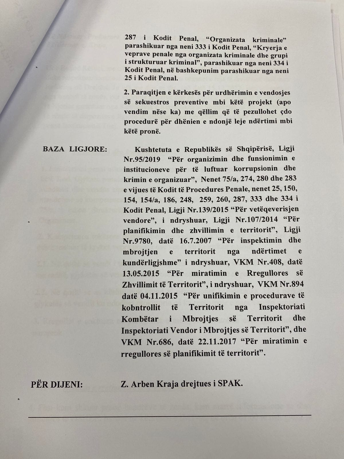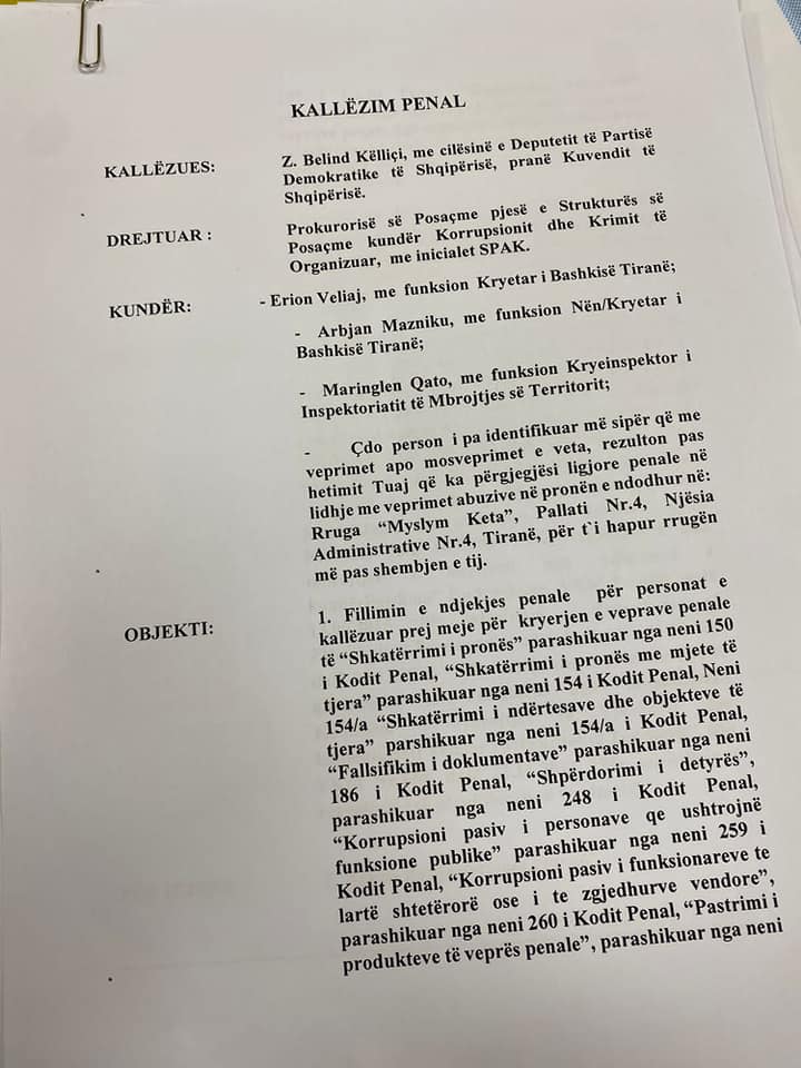 “Hapi i radhës.Kallëzim në SPAK për Erion Veliaj, Arbjan Mazniku, Maringlen Qato dhe për të gjithë personat që me veprimet dhe mosveprimet e tyre kanë përgjegjësi ligjore për ngjarjet në pallatin nr. 4, në rrugën “Myslym Keta”.Vazhdon!”, shkruan në FB, përkrahë shkresave deputeti.