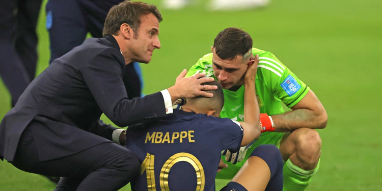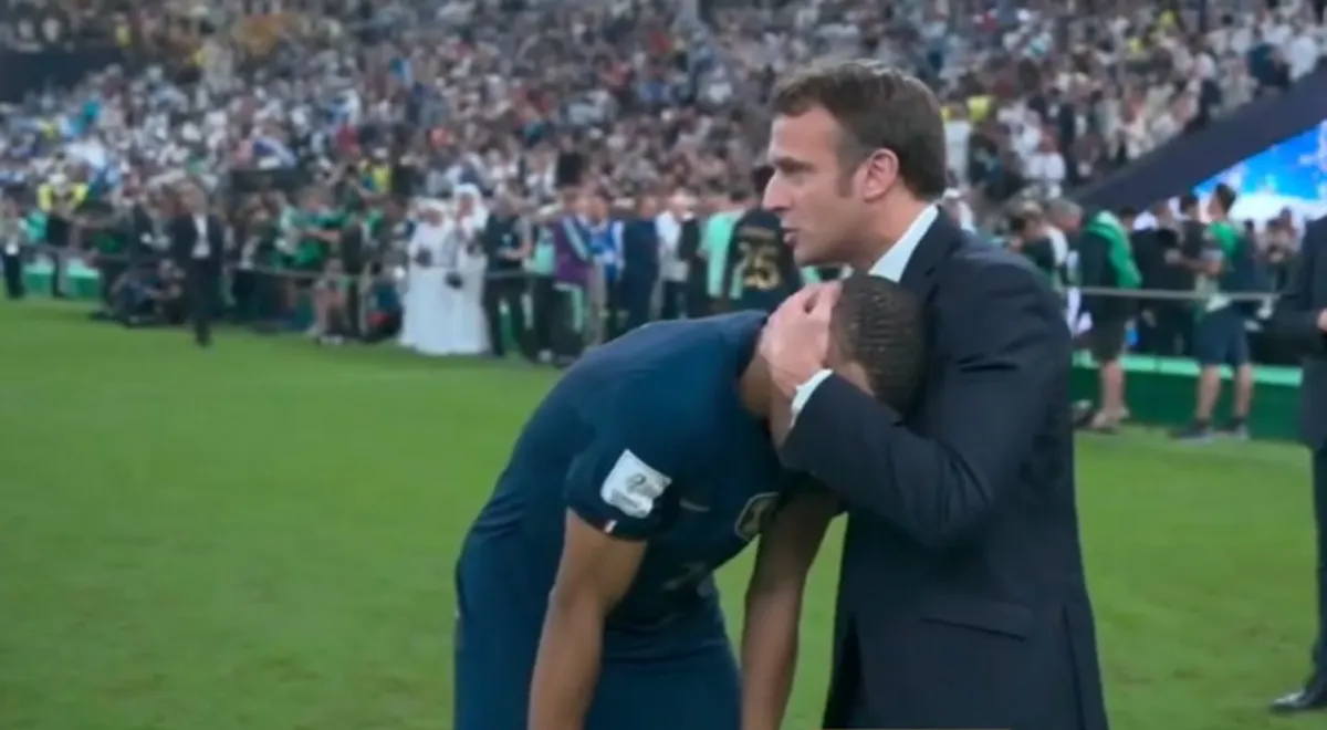 French President Emmanuel Macron consoles Kylian Mbappé after falling short of the World Cup trophy.
