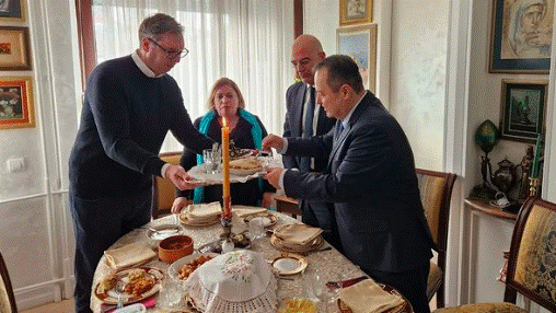 “Në shtëpinë e prindërve të mi sot në Shën Nikollë prita Ministrin e Punëve të Jashtme të Greqisë, Nikos Dendias dhe Ivica Daçiçin. Faleminderit që nderuat shtëpinë e Vuçiçit! Rroftë miqësia serbo-greke!”, shkruan ai, ndërsa në fotot e postuara në Instagram shihet me tabaka në dorë, duke u shërbyer vetë miqve.