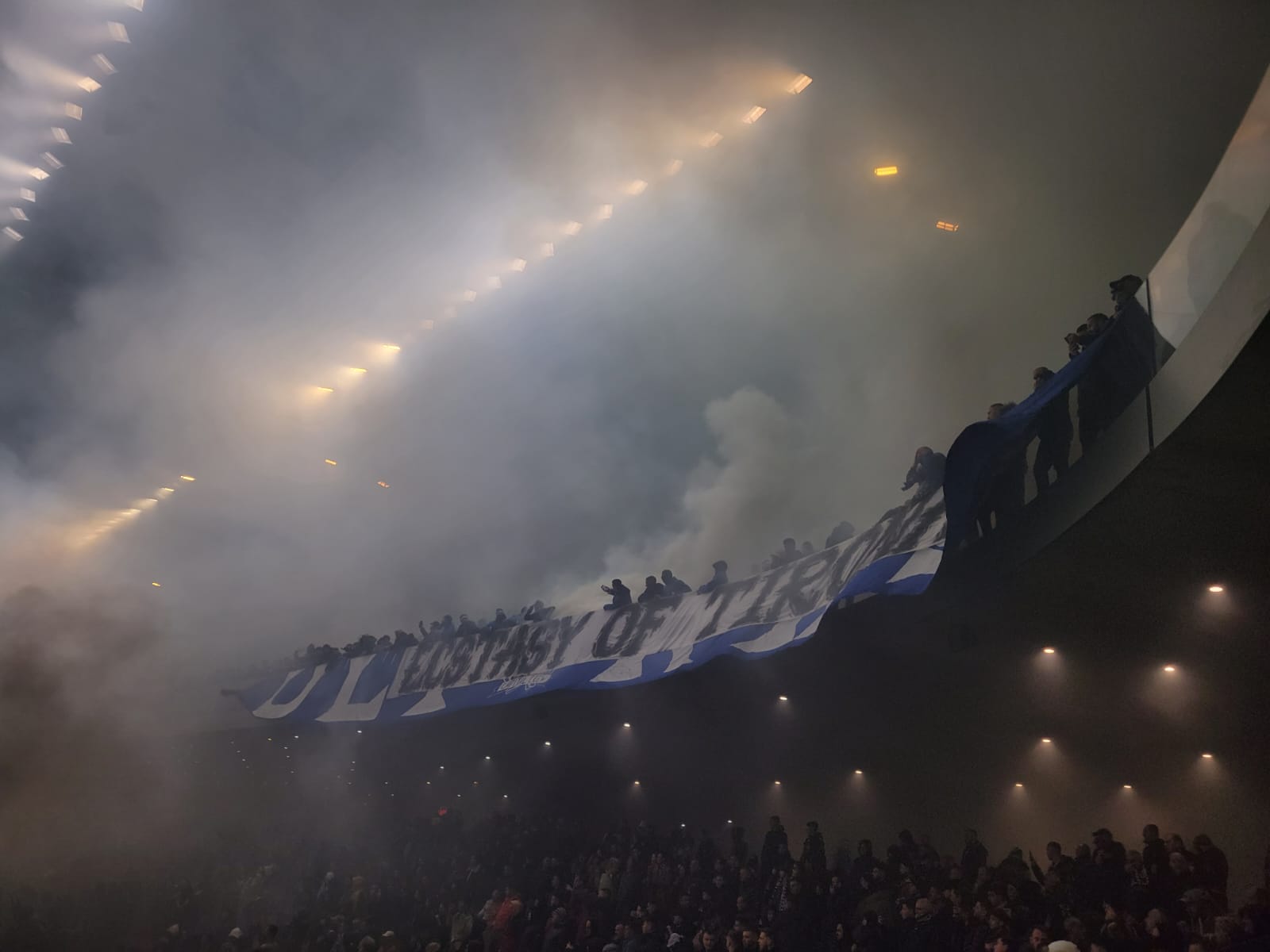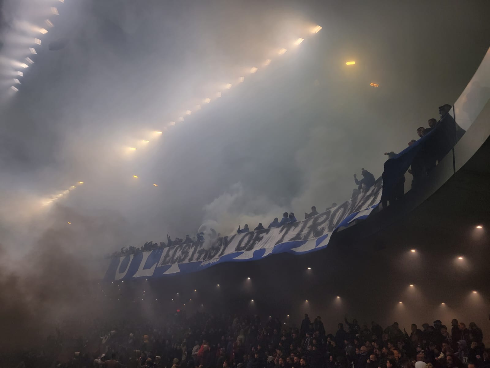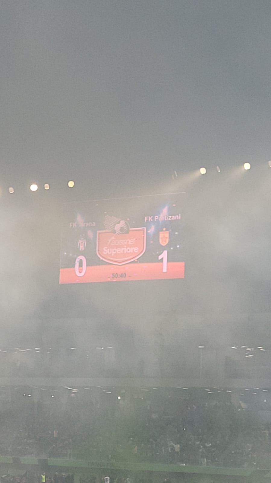 Kapitenët e dy skuadrave shkuan tek tifozët respektivë dhe u kërkojnë që të qetësohen. Një re e bardhë tymi pushtoi stadiumin për disa minuta, nga flakadanët e ndezur nga tifozët e Tiranës.