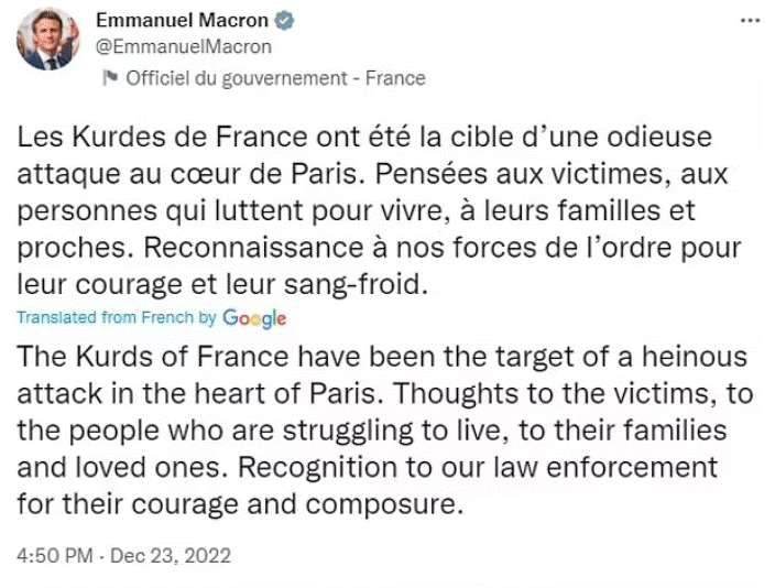 “Kurdët e Francës kanë qenë objektivi i një sulmi të tmerrshëm në zemër të Parisit. Mendime për viktimat, për njerëzit që po luftojnë për të jetuar, për familjet dhe të dashurit e tyre. Njohje për forcat tona të rendit për guximin dhe qetësinë e tyre”, tha Macron.