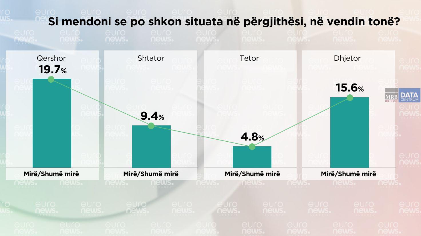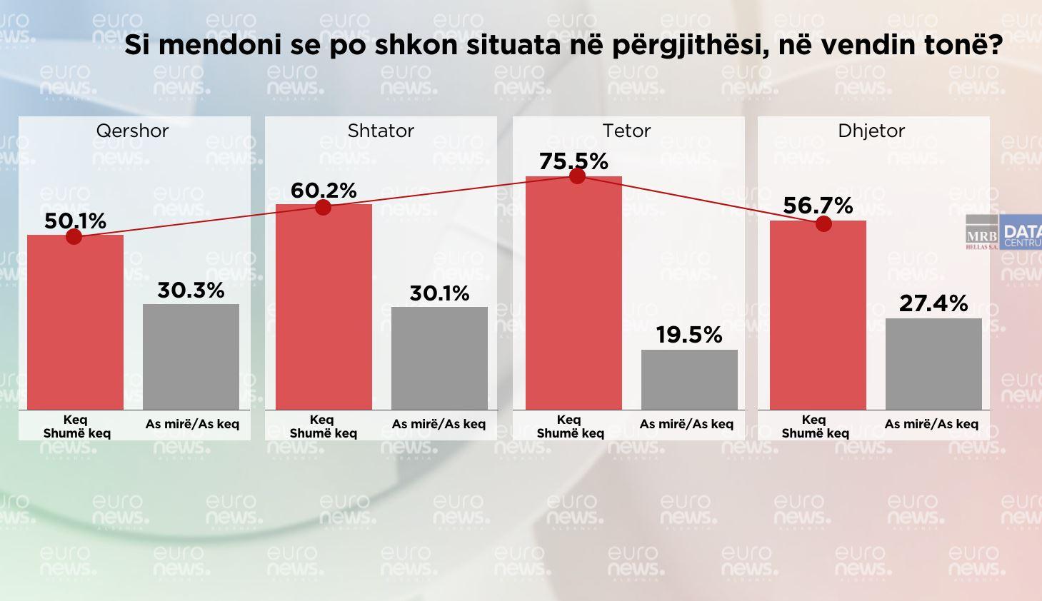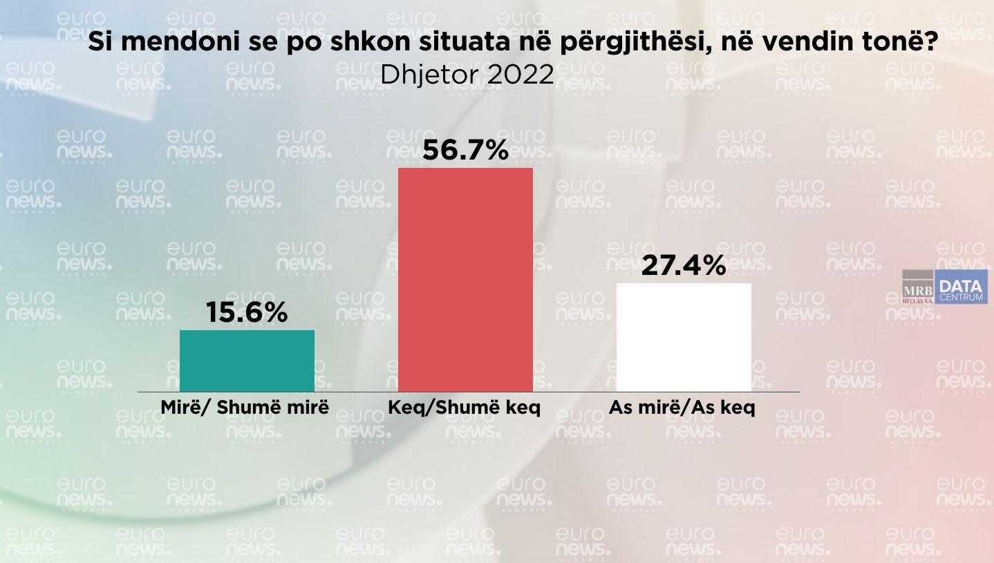 56.7% e shqiptarëve mendojnë se situata në vendin tonë është shumë keq. Të pyetur nga “Barometri” në “Euronews Albania” në muajin dhjetor, vetëm 15.6% e shqiptarëve mendojnë se situata është mirë. Ndërsa 27.4% janë neutralë, as mirë e as keq.