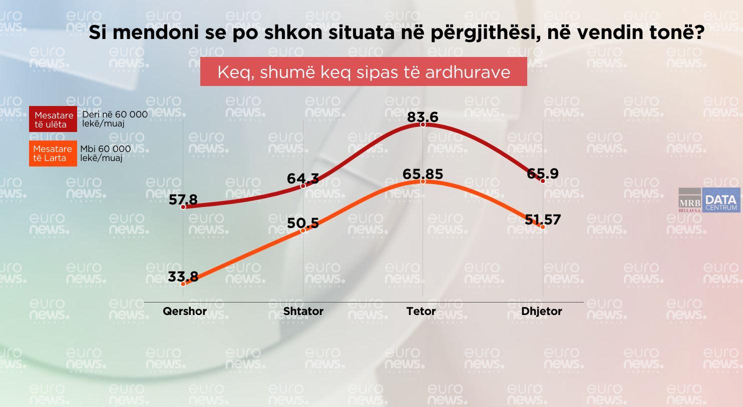 Tek ata që situatën e shohin keq, më shumë vend zënë ata me paga mesatare, të ulëta deri në 60.00 lekë në muaj. Për muajin qershor, 57.8% i zënë ata me paga të ulëta dhe 33.8% me paga më të larta. Për shtatorin 64.3% janë me pagë të ulët dhe 50.5% me pagë më të lartë. Për tetorin 83.6% janë me pagë më të ulët dhe 65.85% janë me pagë më të lartë. Për muajin dhjetor 65.9% janë me paga të ulëta dhe 51.57% janë me paga të larta.