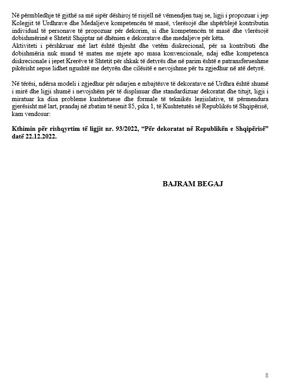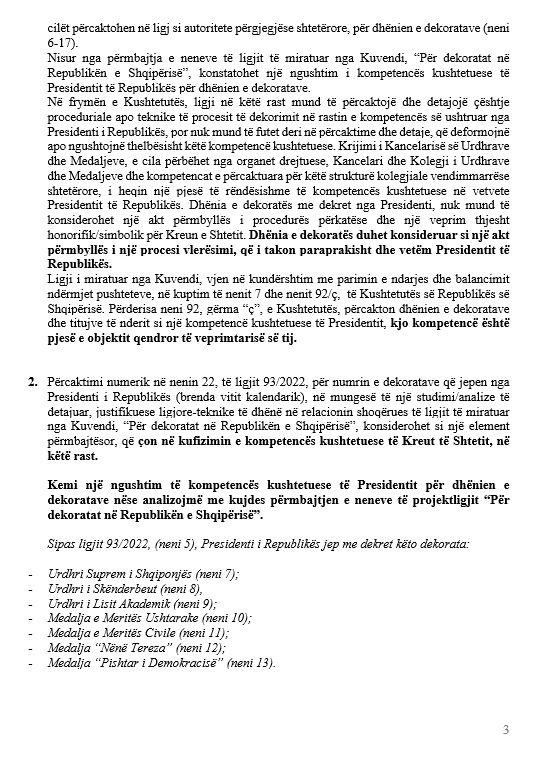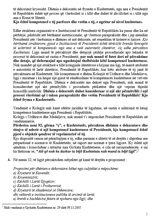 Më tej në arsyetim, kreu i shtetit shprehet në thelb se sipas legjislacionit në fuqi, është ai autoriteti që jep dekoratat dhe ligji s’ka vend për rregullime në këtë aspekt. “Është e qartë, se në këtë rast kemi të bëjmë me një kompetencë kushtetuese të Presidentit të Republikës, i cili në kuptim të Kushtetutës, është një institucion i pavarur kushtetues, me ligj rregullohet mënyra e dhënies së dekoratave dhe titujve të nderit, pasi është e qartë se cili është organi që i jep ato. Një kompetencë të tillë, të përcaktuar shprehimisht në Kushtetutë, nuk e ka në të njëjtin nivel as Kuvendi i Republikës së Shqipërisë, as Kryeministri dhe as Ministrat përkatës, të cilët përcaktohen në ligj si autoritete përgjegjëse shtetërore, për dhënien e dekoratave”, arsyeton kreu i shtetit.