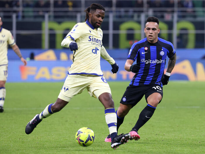 Verona’s Adrien Tameze' (L) challenges for the ball Inter Milan’s Lautaro Martinez during the Italian serie A soccer match between FC Inter and Verona Giuseppe Meazza stadium in Milan, 14 January 2023. ANSA / MATTEO BAZZI