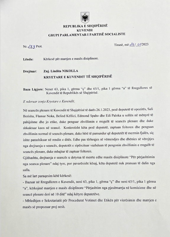 Për Flamur Nokën, Belind Këlliçin, Edmond Spahon dhe Edi Palokën, një grup deputetësh i Partisë Socialiste ka paraqitur para Sekretariatit për Procedurat, Votimet dhe Etikën kërkesën për marrje mase disiplinore.