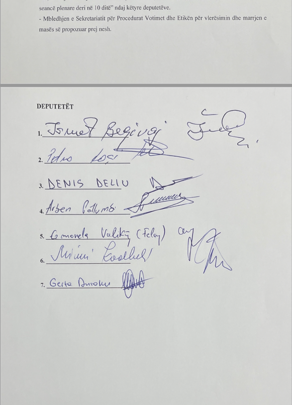 Janë 7 deputetë të PS që kanë kërkuar përjashtimin me 10 ditë nga seancat plenare për 5 ligjvënësit e PD. Kanë qenë Ismet Beqiraj, Petro Koçi, Denis Deliu, Arben Pëllumbi, Ermonela Felaj, Mimi Kodheli dhe Gerta Duraku nga radhët e PS që kanë firmosur shkresën.