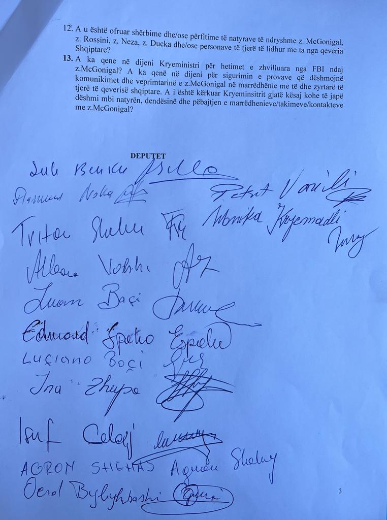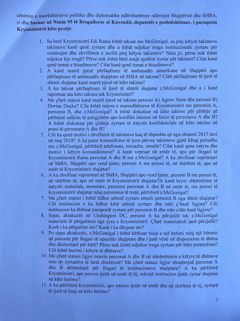 Në këtë kërkesë, 13 deputetët e PD kanë paraqitur edhe pyetjet e tyre ndaj Ramës lidhur me marrëdhënien dhe takimet që ka zhvilluar me ish-zyrtarin e FBI, McGonigal.