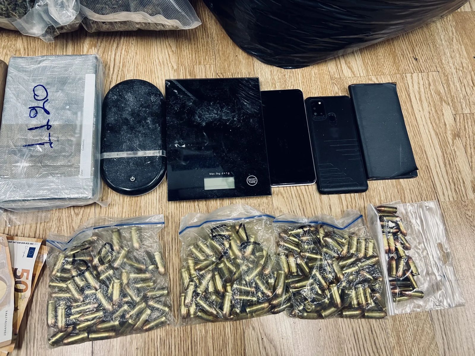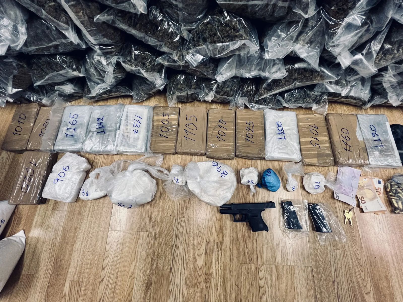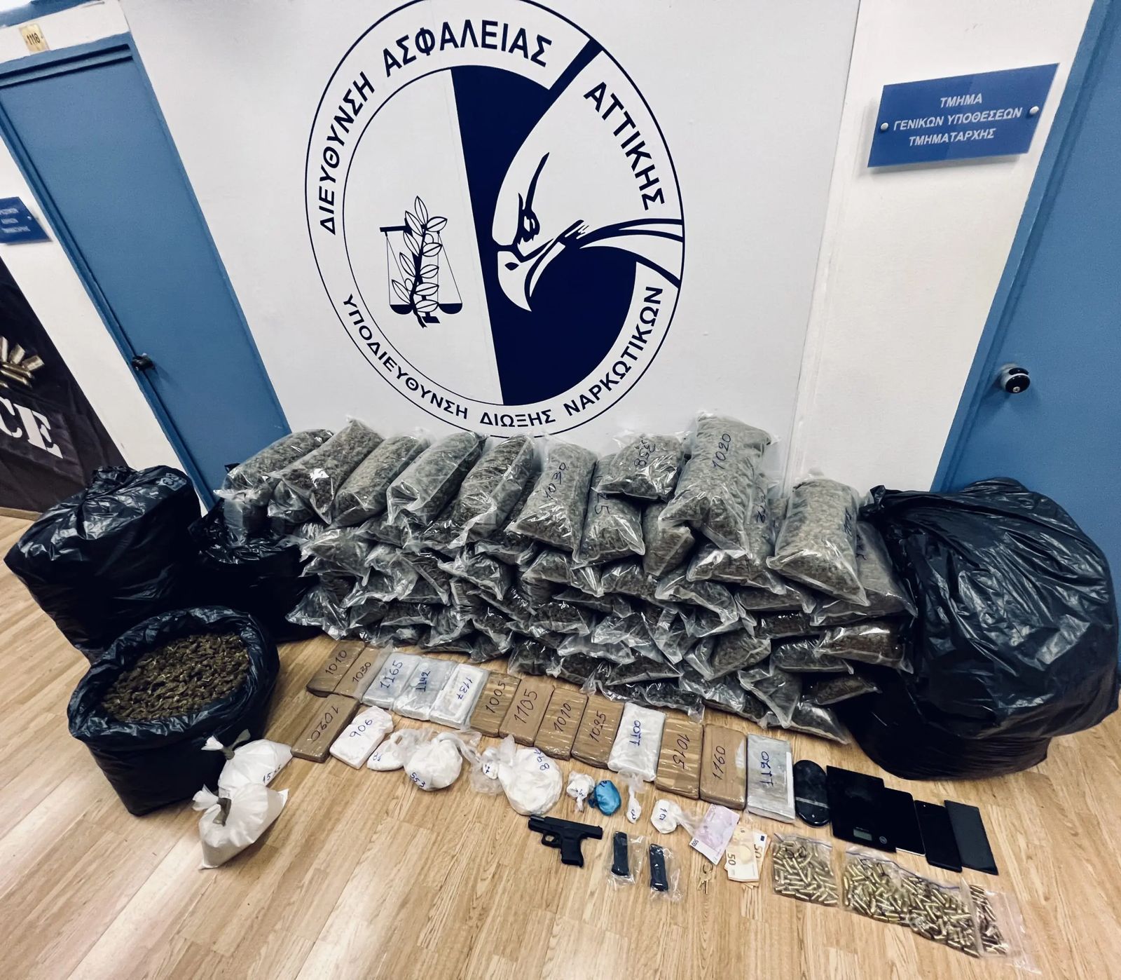 Policia ka lokalizuar në banesën në Aegaleo dhe ka konfiskuar 18 kg kokainë, 122 kg hashash, një pistoletë, fishekë dhe disa peshore. Droga e sekuestruar mendohet të kapë vlerën e 820 mijë eurove.