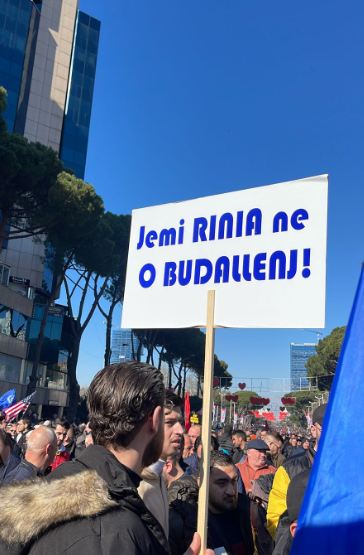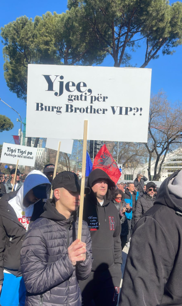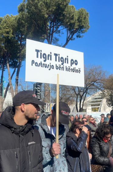 Në një prej pankartave pikante, qytetarët shkruajnë me ironi “Tigri, tigri por pastruesja bën kjërdinë”, duke iu referuar rastit të vjedhjes në banesën e ish-zyrtares Alda Klosi të një shumë prej mijëra eurosh nga pastruesja Rozeta Dobi.