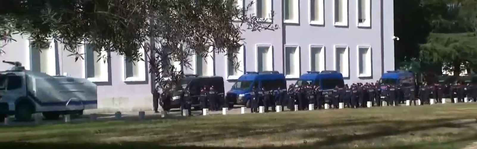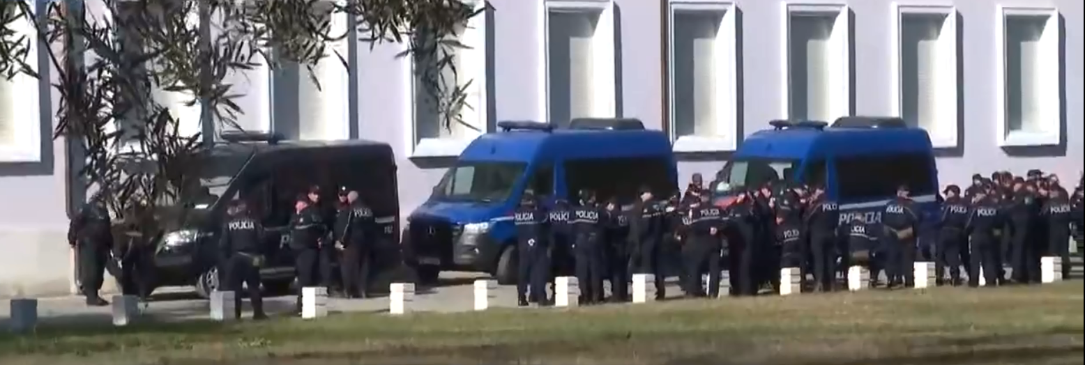 Në pamje shihen efektivë të shumtë si dhe furgona policie mbrapa kryeministrisë.