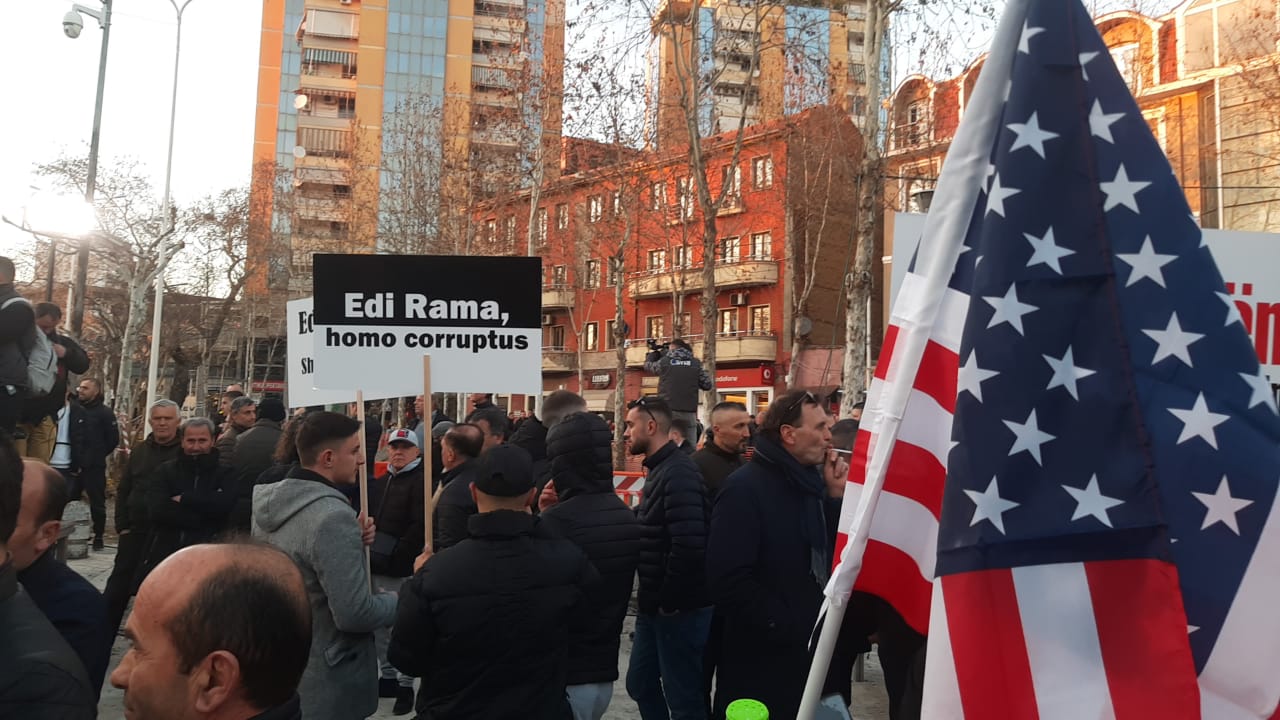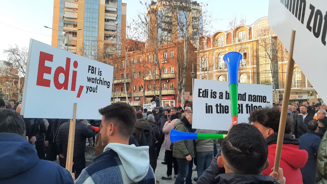 “Demokracisë i dalim Zot”, “Edi FBI is watching you”, “Edi is a brand name … in the FBI files”, ishin disa nga mbishkrimet në pankartat e shpalosura nga opozita.