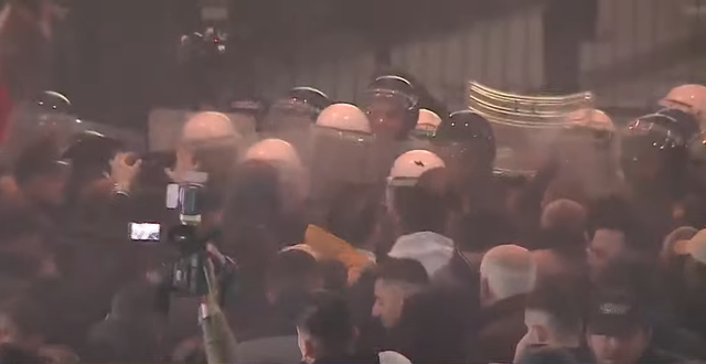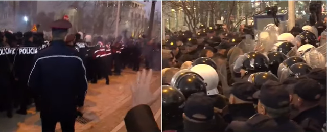 Menjëherë forcat e rendit janë tërhequr nga vija e parë, ndërsa në ballë të kordonit që ruan Kuvendin janë vendosur Forcat e Ndërhyrjes së Shpejtë me skafandra, duke shtyrë protestuesit.