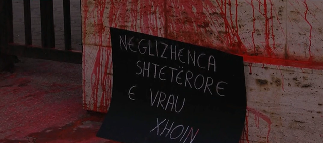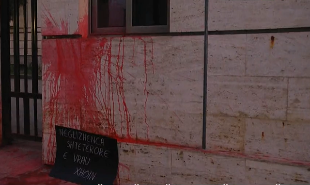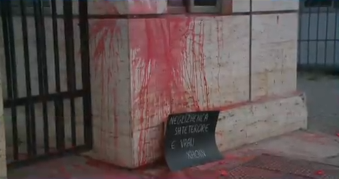 Protestuesit hodhën bojë në muret e Prokurorisë, ndërsa një pankartë në të cilën shkruhej “Neglizhenca shtetërore e varu Xhoin”, u vendos aty.