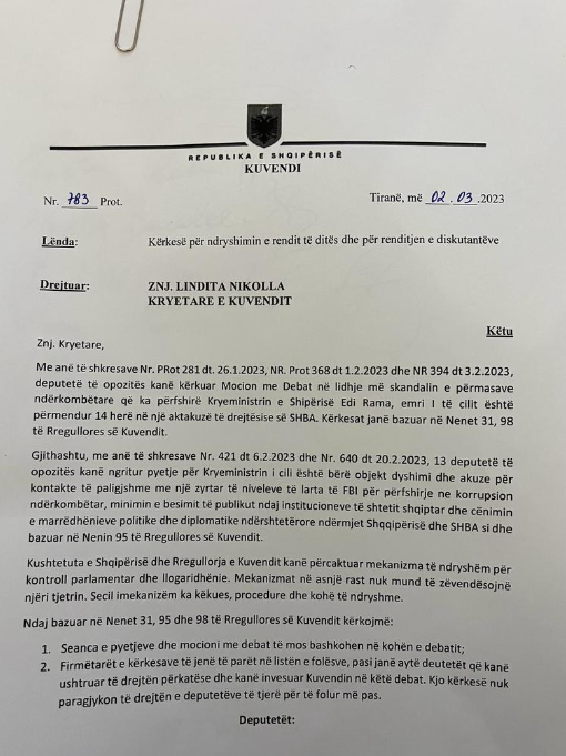 Gjithashtu në kërkesën e firmosur nga 6 deputetët e PD-së kërkohet që seanca e pyetjeve dhe mocioni me debat të mos bashkohet në kohën e debatit.