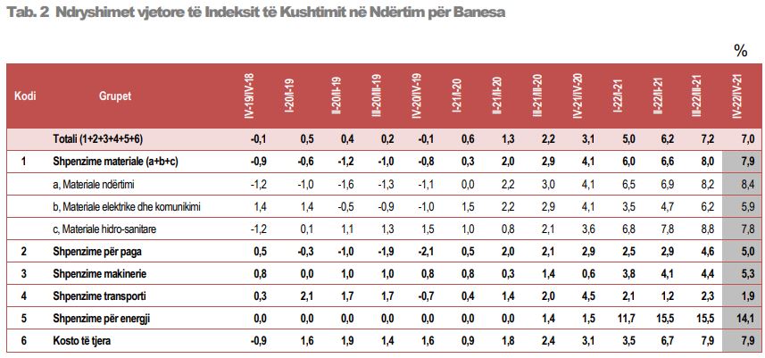 Sipas INSTAT, Indeksi i Kushtimit në Ndërtim, në tremujorin e katërt 2022 arriti 110,3 kundrejt tremujorit të katërt 2020 si periudha bazë. Ndryshimi vjetor i Indeksit të Kushtimit në Ndërtim në tremujorin e katërt 2022 është 7,0%, një vit më parë ky ndryshim ishte 3,1%.