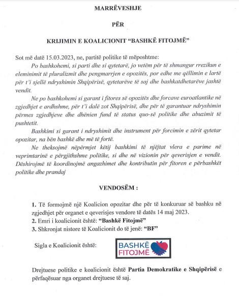 Në kërkesën e bërë nga Partia e Lirisë, zbulohet se koalicioni do të njihet me emrin “Bashkë Fitojmë” si dhe sigla e cila do të përdoret në fushatë dhe në fletën e votimit.