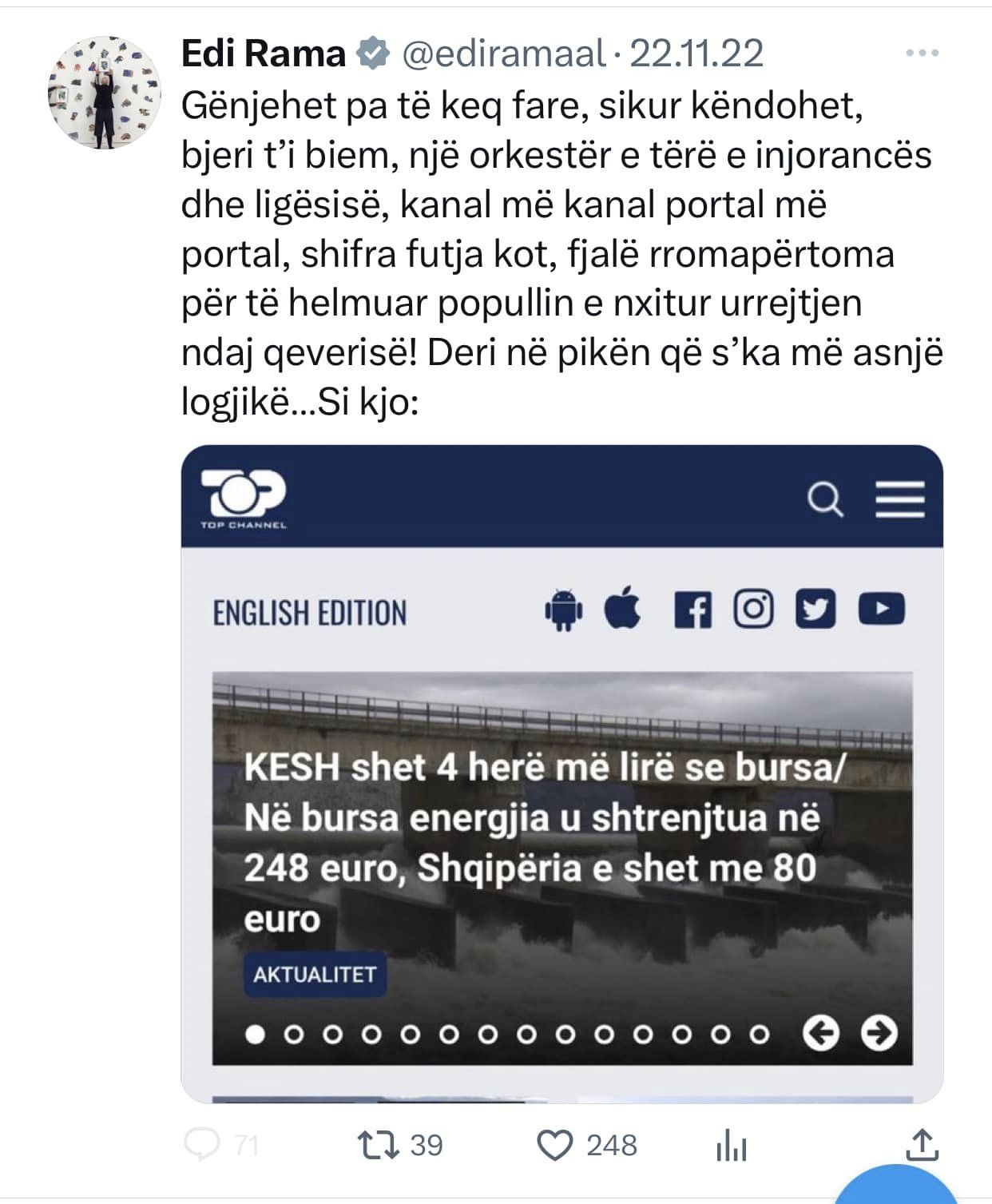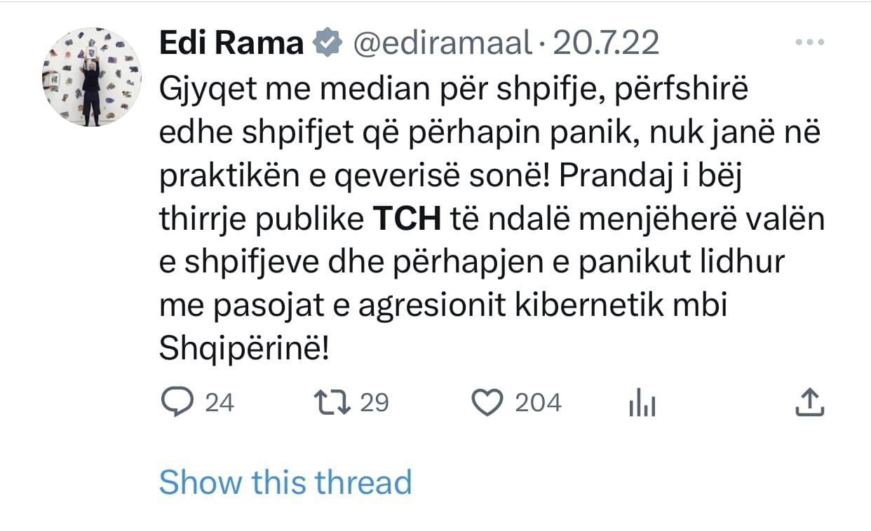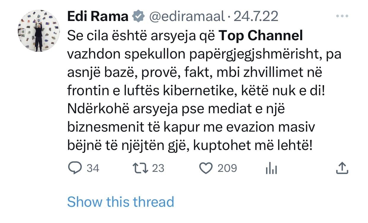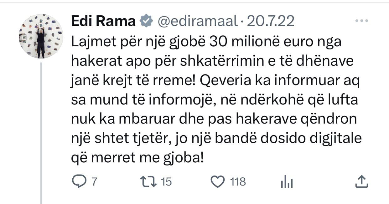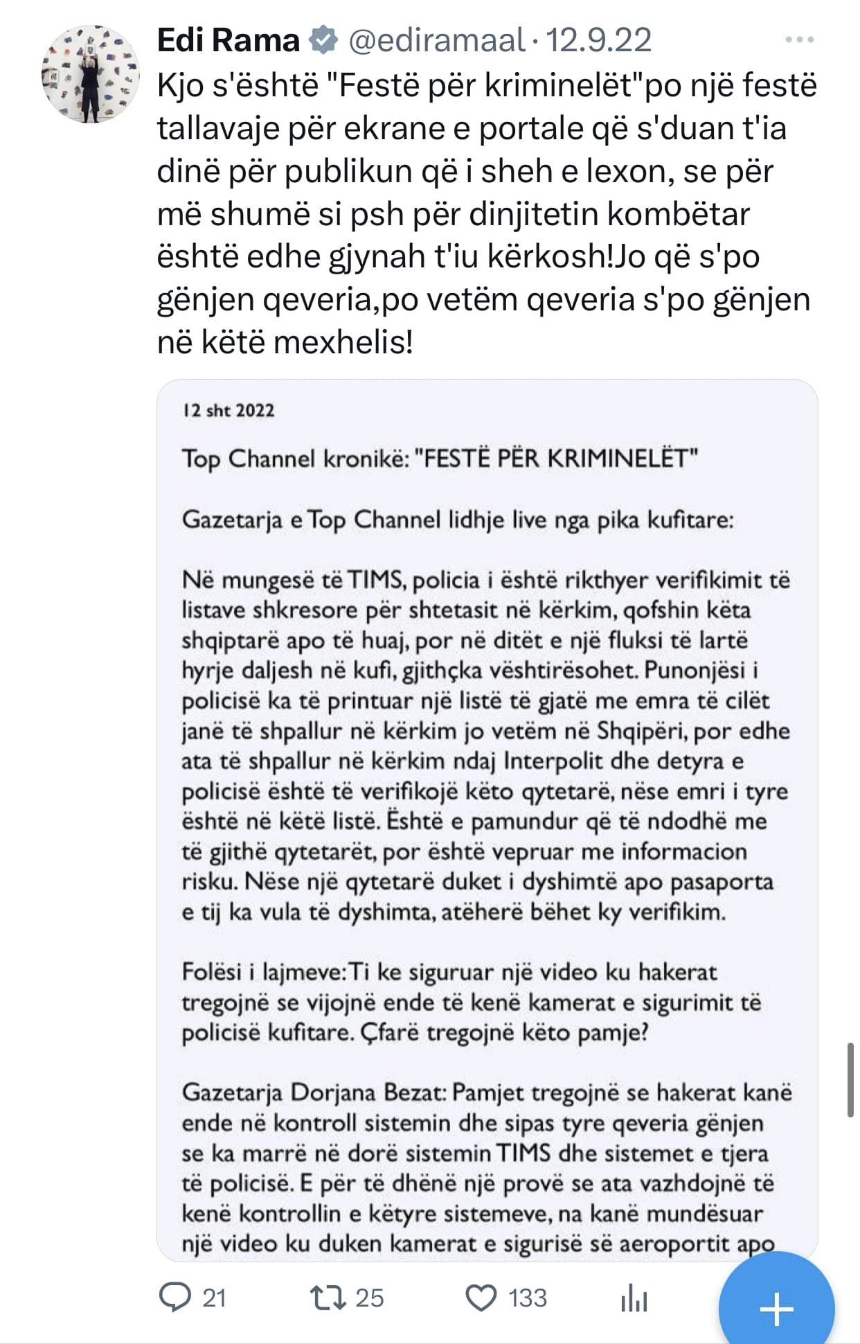 Top Channel ishte kanali i pare qe raportoi per nje gjobe qe i ishte vendosur qe qeverise shqiptare nga hackerat iranian gjate sulmit kibernetik. Cfare beri Edi Rama? Qe prej 20 Korrikut 2022 e deri ne 11 Nentor 2022, Edi Rama mori ne dore “kallash-twitter-in” duke qelluar pa ndalim kunder Top Channel!