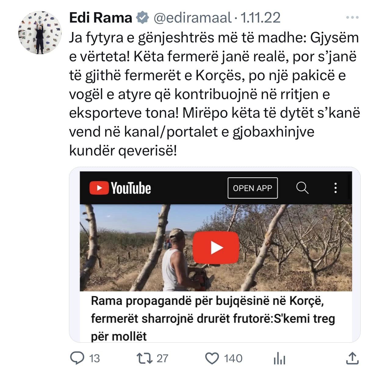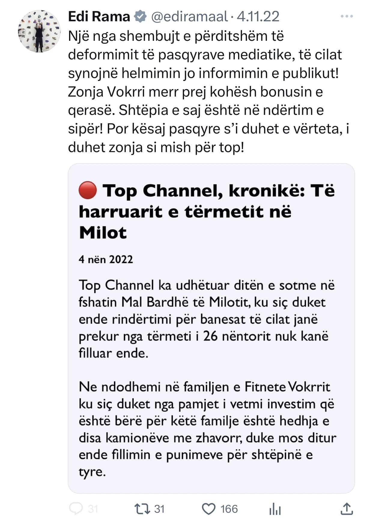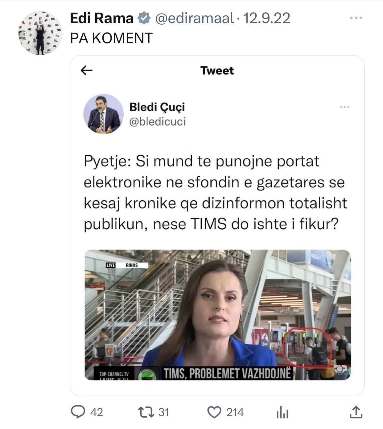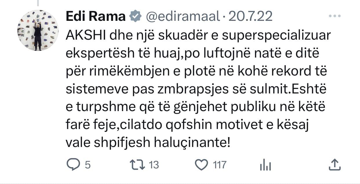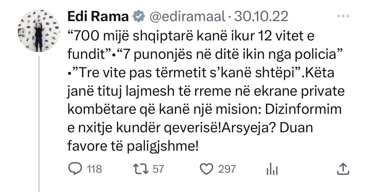 Top Channel ishte kanali i pare qe raportoi per nje gjobe qe i ishte vendosur qe qeverise shqiptare nga hackerat iranian gjate sulmit kibernetik. Cfare beri Edi Rama? Qe prej 20 Korrikut 2022 e deri ne 11 Nentor 2022, Edi Rama mori ne dore “kallash-twitter-in” duke qelluar pa ndalim kunder Top Channel!
