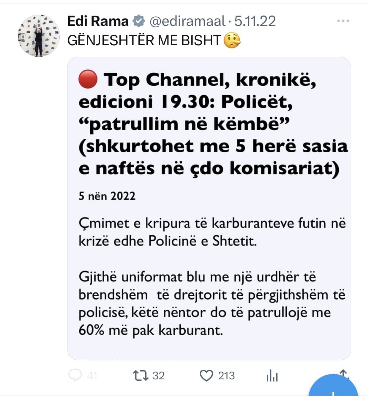 p.s… “nxitesi” i vertete i sulmit te mesnates ndaj Top Channel eshte vetem Edi Rama, e fakteqesisht kesaj here nuk u plagos krenaria e ekranit, por humbi jeten roja i ndjere😢