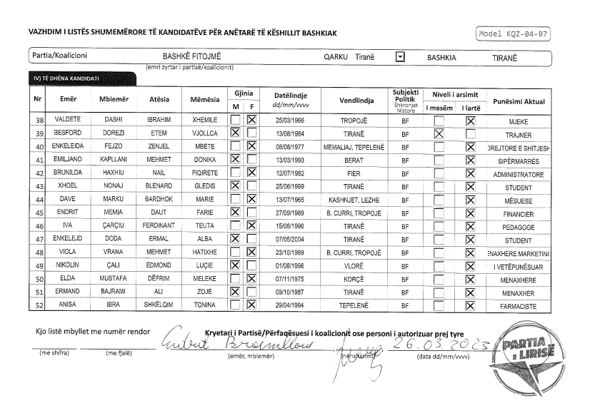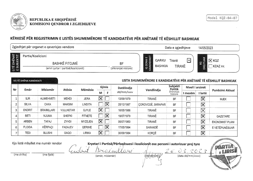 Ashtu siç ishte paralajmëruar nga Këlliçi pas garës së “Primareve” lista për “parlamentin” lokal kryesohet nga mjeku i njohur epidemiolog Ilir Alimehmeti dhe pas tij në listë vjen ish-deputetja Silva Caka nga Partia e Lirisë. Në listë nga PL gjenden edhe dy ish-deputetë të tjerë, Endrit Braimllari dhe Floida Kërpaçi.