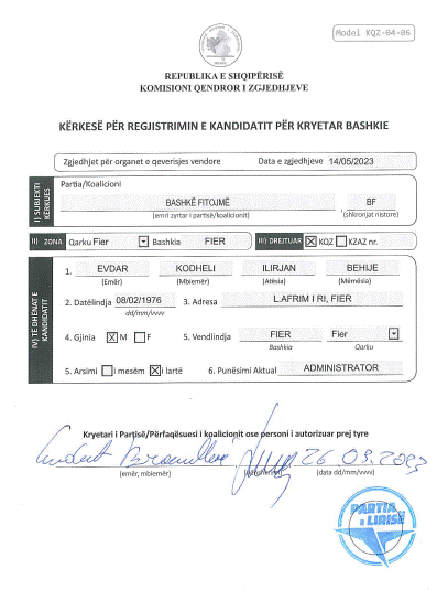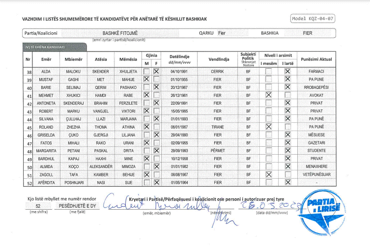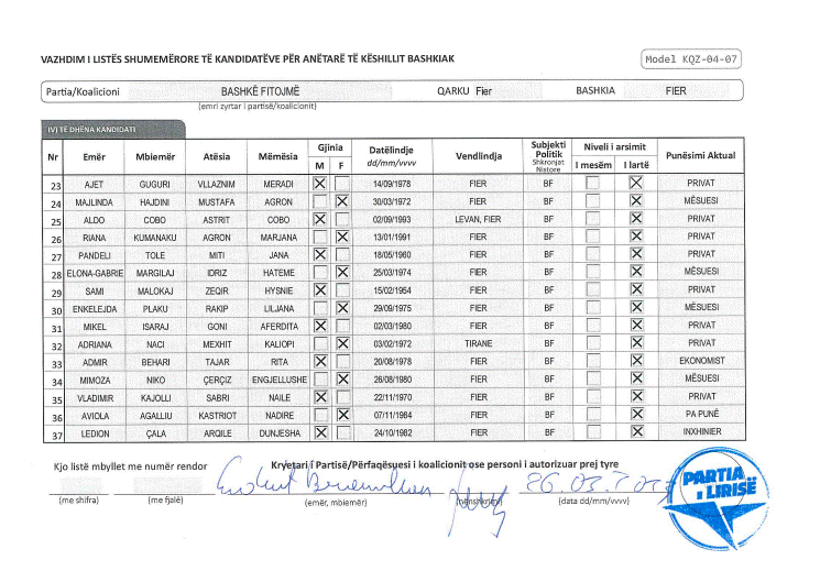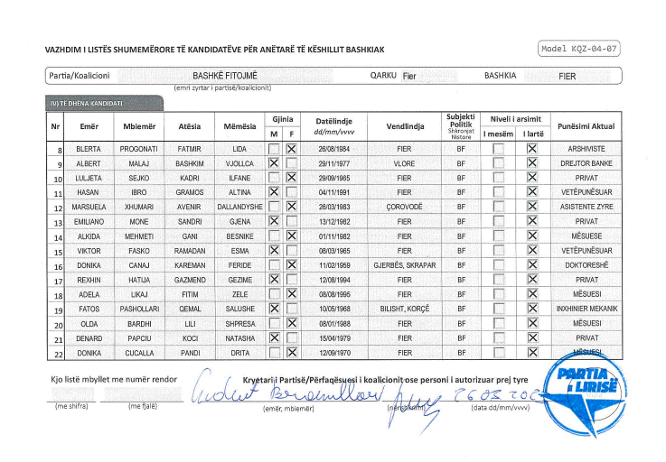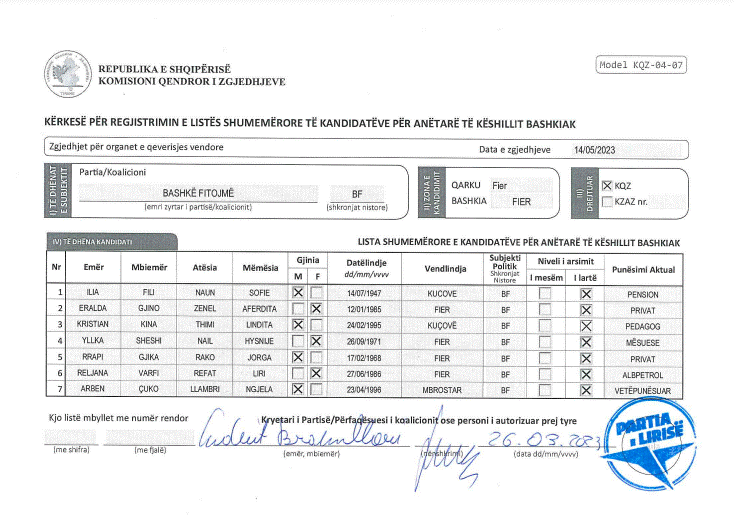 Lista e kandidatëve të koalicionit “Bashkë Fitojmë” për Këshillin Bashkiak të Fierit