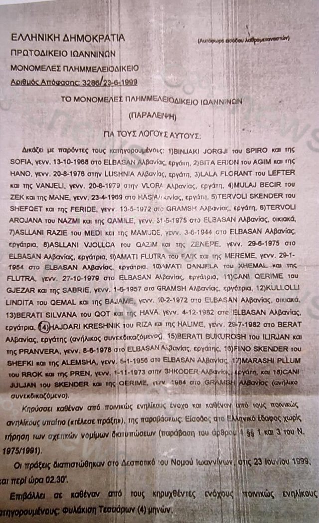 Në vendimin e gjykatës së Janinës, ndër të tjera urdhërohet dhe dëbimi i menjëhershëm i Kreshnik Hajdarit, që në atë periudhë kishte shkuar si emigrant në Greqi.