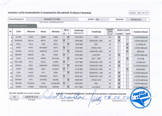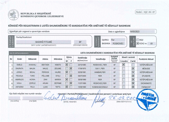 Lista e kandidatëve të koalicionit “Bashkë Fitojmë” për Këshillin Bashkiak të Roskovecit