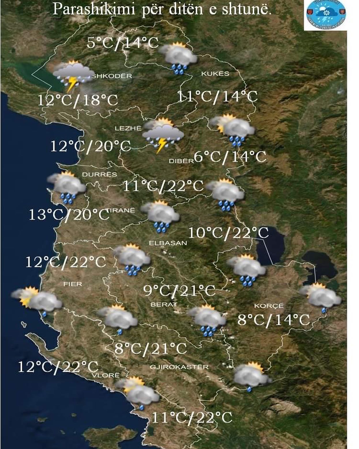 Reshje shiu që në orët e para të mëngjesit fillimisht në veriperëndim e gradualisht do të shtrihen edhe në pjesën tjetër të vendit. Reshjet pritet të jenë me intensitet të ulët në jug ndërsa në veriperëndim dhe qendër me intensitet mesatar e lokalisht të lartë.