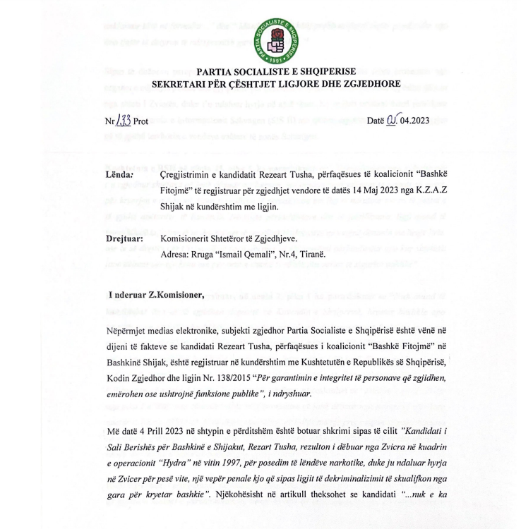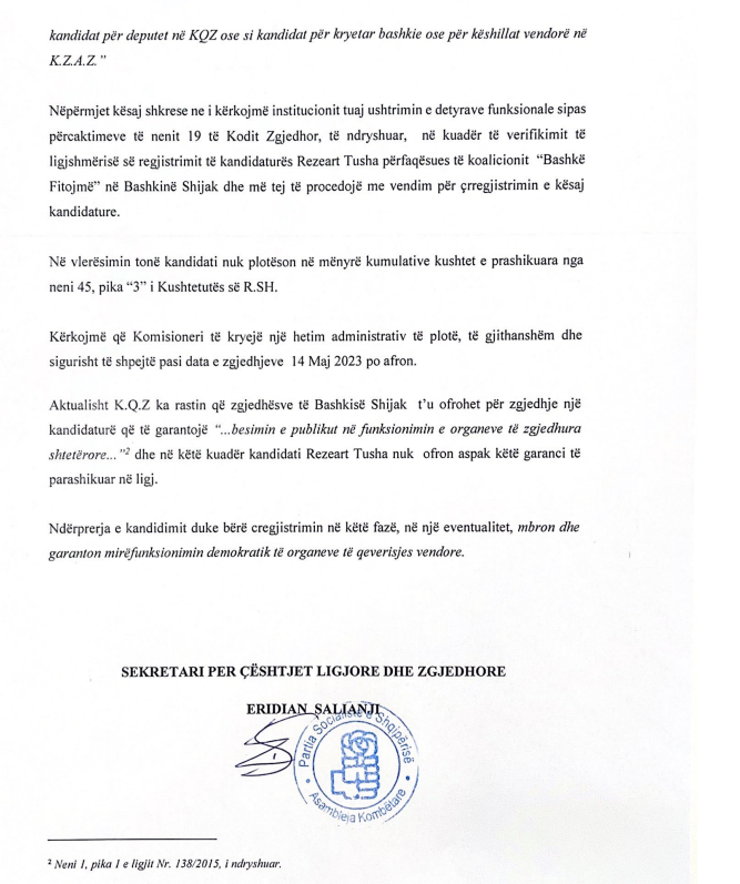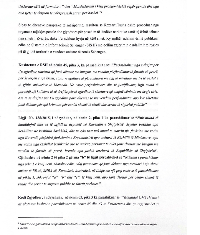 “Në vlerësimin tonë kandidati nuk plotëson kushtet e parashikuara në nenin 45 të pikës 3 të kushtetutës. Kërkojmë që komisioneri të kryejë hetim administrativ të plotë, të gjithanshëm dhe të shpejtë pasi data e zgjedhjeve po afron. Aktualisht KQZ ka rastin që zgjedhësve të Bashkisë Shijak t’u ofrohet për zgjedhje një kandidaturë që të garantojë “besimin e publikut për funksionin e organeve të zgjedhura shtetërore” dhe në këtë kuadër kandidati Rezeart Tusha nuk e ofron aspak këtë garanci. Ndërprerja e kandidimit duke bërë çregjistrimin e në këtë fazë, në një eventualitet, mbron dhe garanton mirëfunksionimin demokratik të organeve të qeverisjes vendore”, thuhet në shkresën drejtuar KQZ-së.