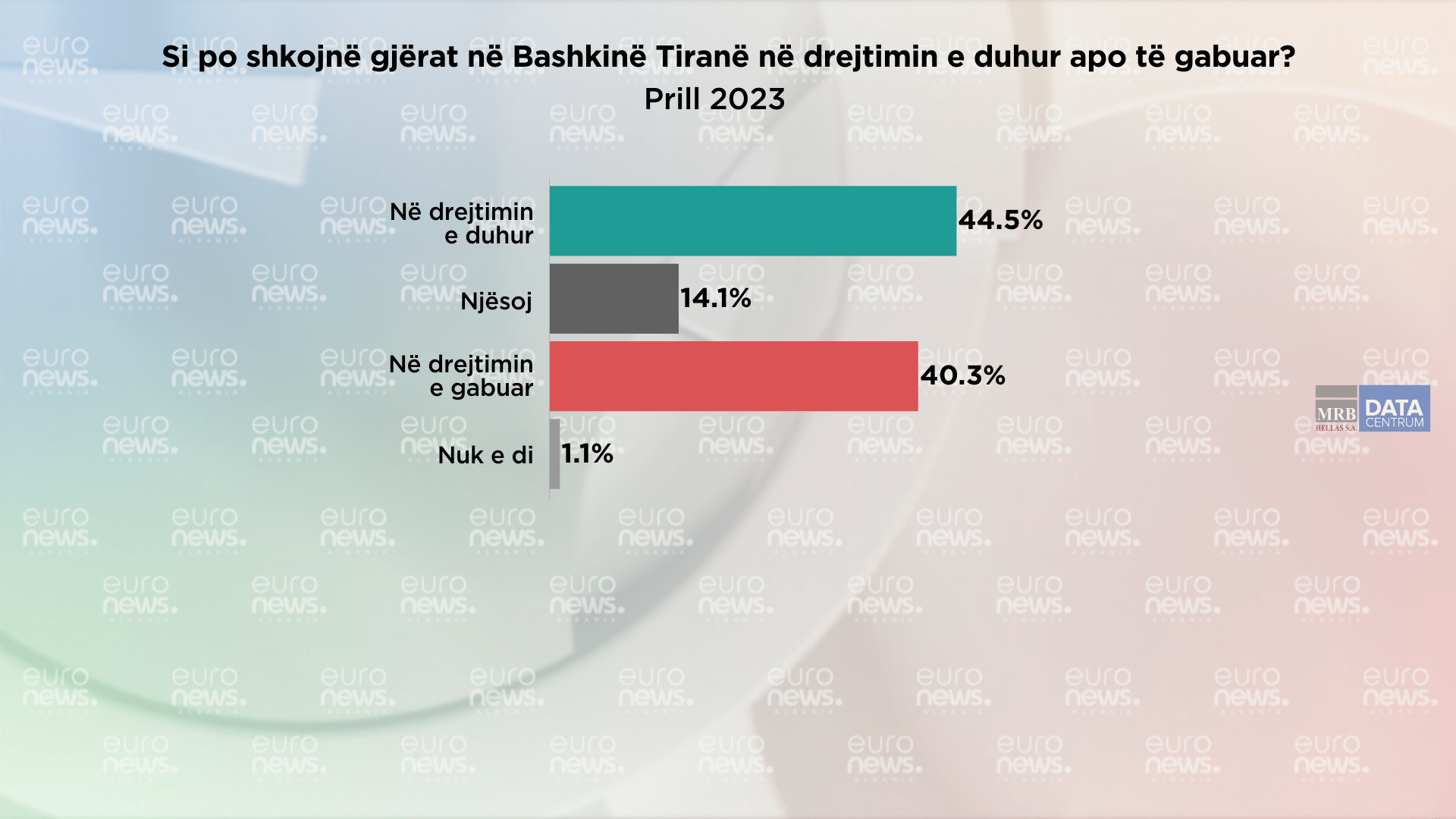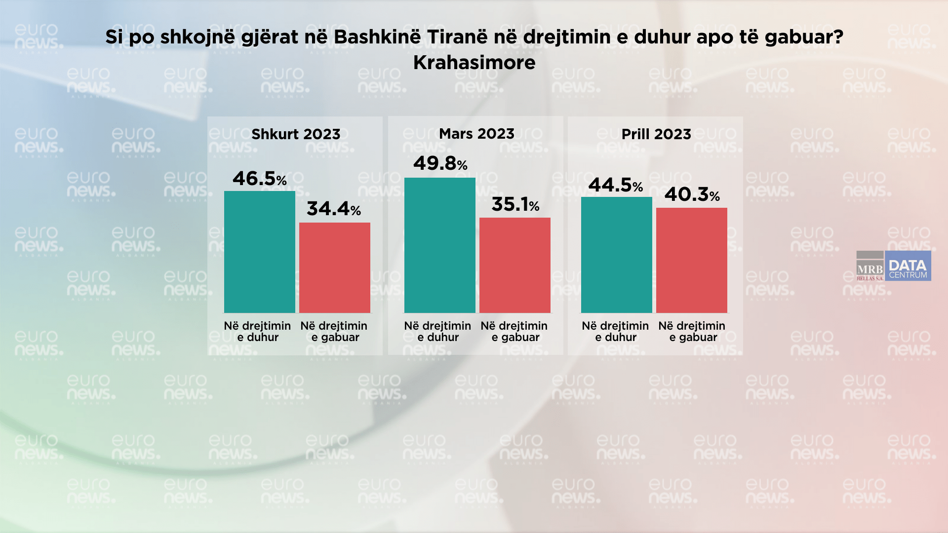 Por kur i krahasojmë përgjigjet për të njëjtën pyetje ka pasur një ndryshim në 3 muajt e fundit. Në muajin shkurt 46.5% mendonin se gjërat po shkojnë në drejtimin e duhur, por kjo shifër ka pasur një rritje në 49.8% në mars, ndërsa në prill ka rënë në 44.5%.