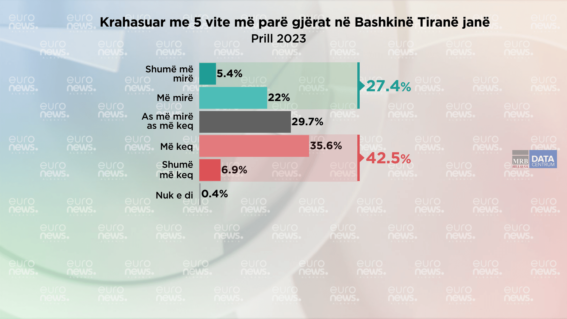 27.4% e qytetarëve mendojnë se gjërat në Bashkinë Tiranë janë më mirë se 5 vite më parë. 29.7% e kryeqytetasve mendojnë se gjërat në Bashkinë Tiranë në 5 vitet e fundit janë njësoj, ndërsa 42.5% mendojnë se gjërat në këto 5 vite janë më keq se ishin më parë.