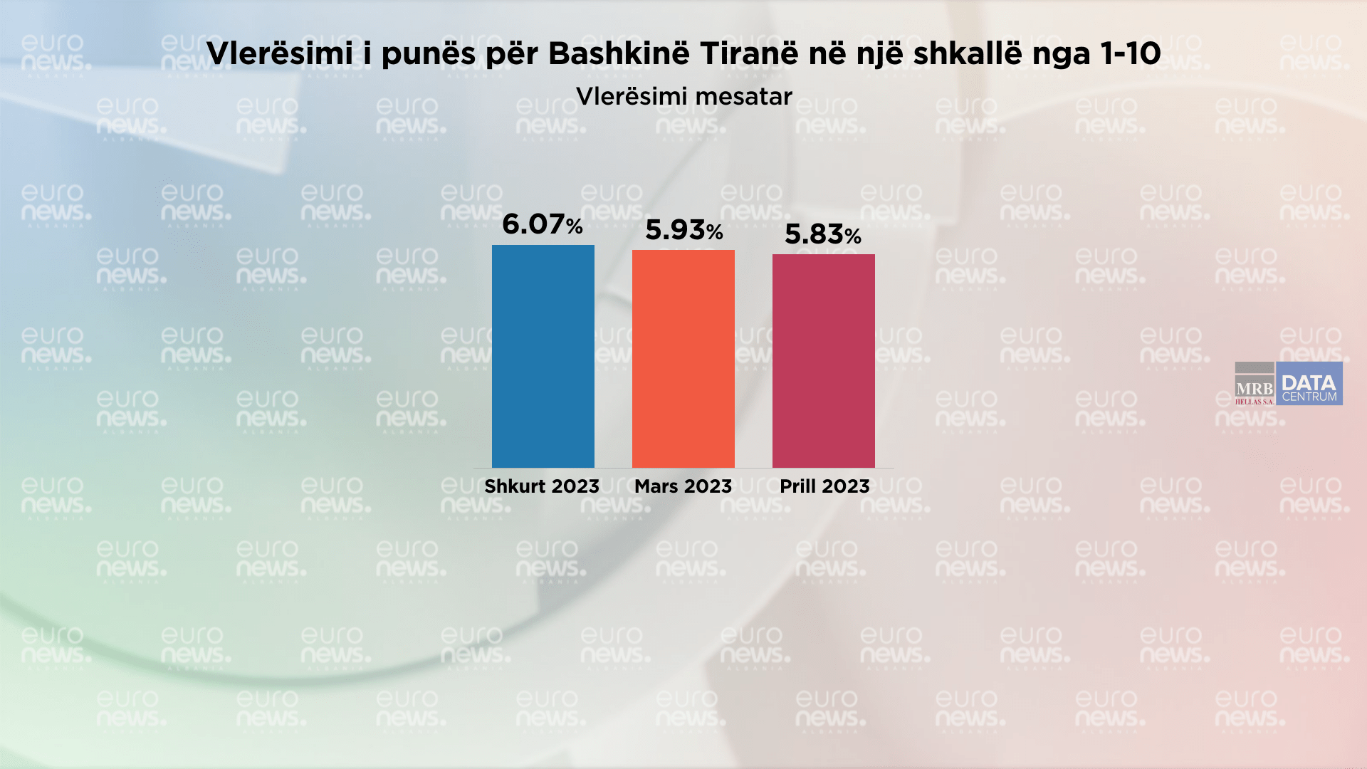 Vlerësimi mesatar për Bashkinë Tiranë në 3 muajt e fundit ka pësuar një rënie nga 6.07% që ishte në shkurt, në 5.93 në Mars, duke shkuar në 5.83% në prill.