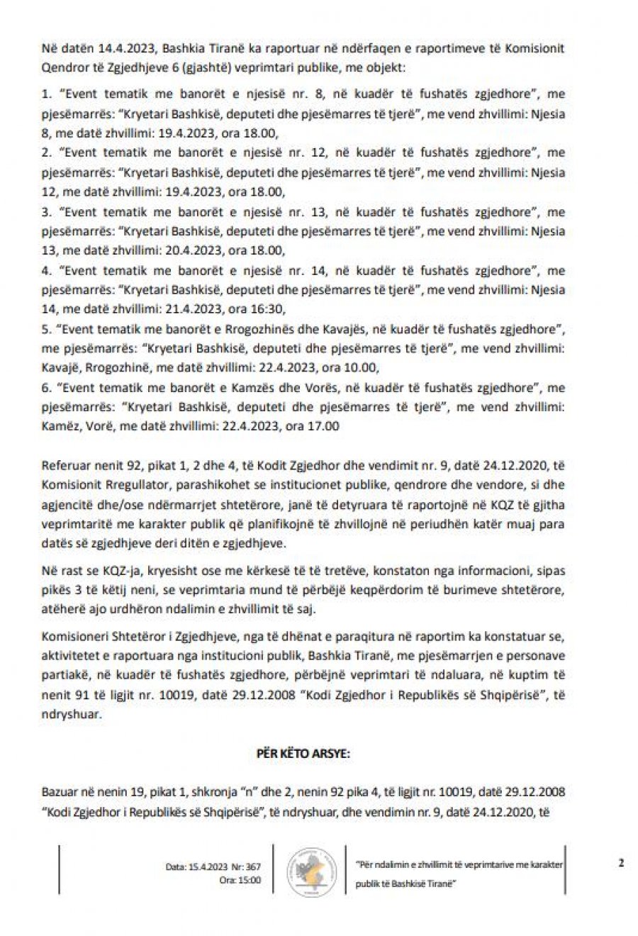 KQZ-ja i ka kërkuar Autoritetit të Mediave që të lajmërojë televizionet që lista e tyre me 9 aktivitete të mos transmetohet. Aktivitetet janë kryesisht takime për qëllime propagande të Erion Veliajt, me banorë të zonave të ndryshme në Tiranë, Kamzë dhe Kavajë.