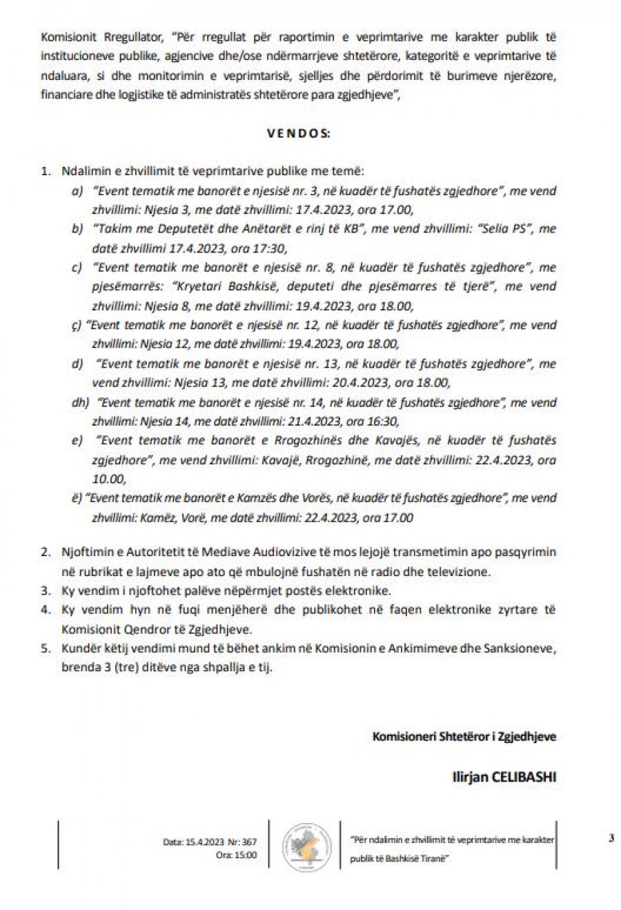 3) ‘Event tematik me banorët e njësisë nr. 8, në kuadër të fushatës zgjedhore’, me pjesëmarrës: ‘Kryetari Bashkisë, deputeti dhe pjesëmarres të tjerë’, me vend zhvillimi: Njësia 8, me datë zhvillimi: 19.4.2023, ora 18.00,