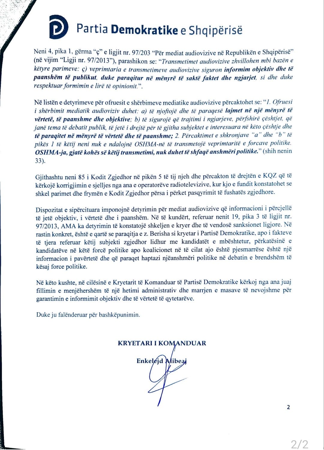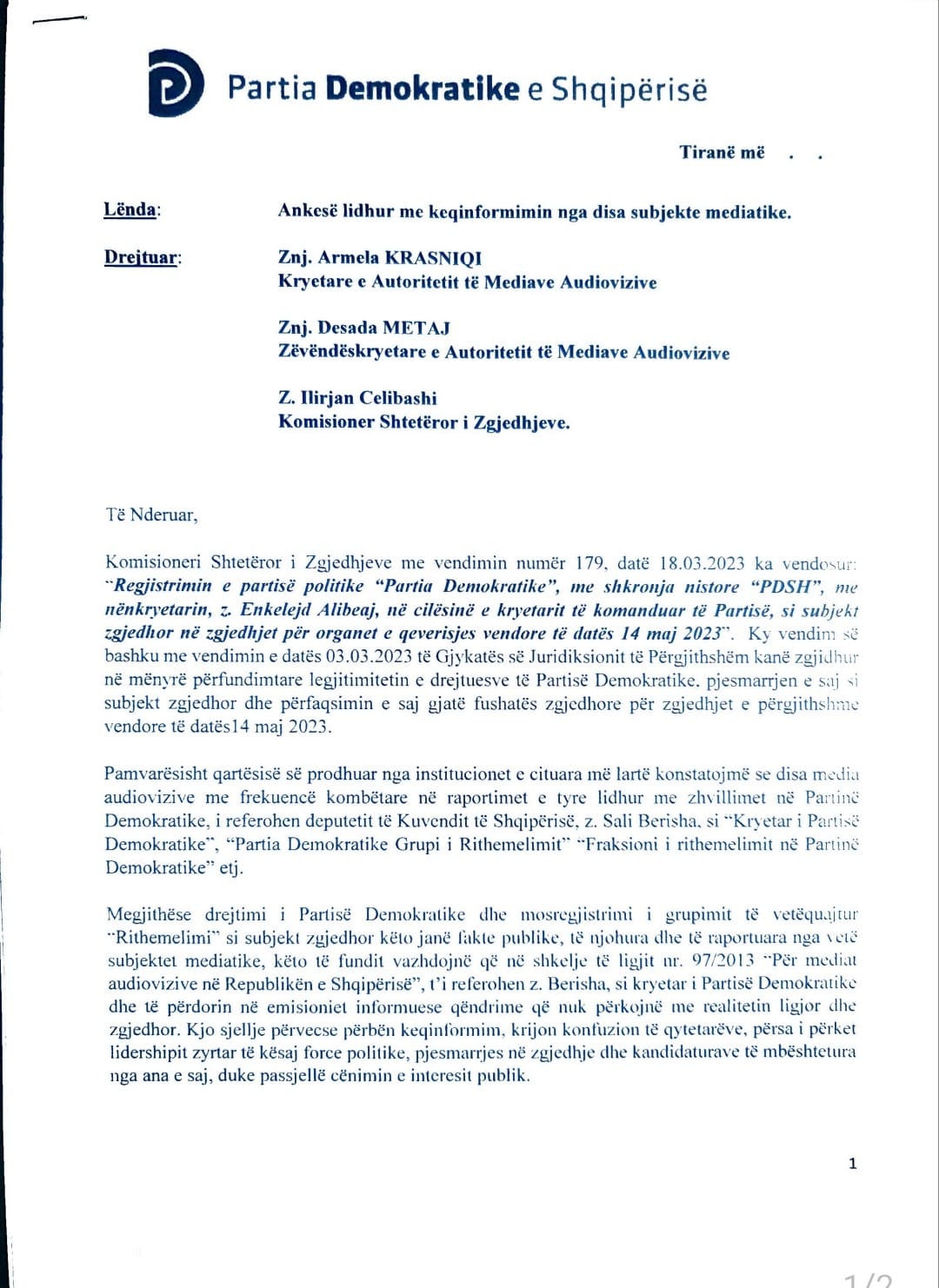 “Megjithëse drejtimi i Partisë Demokratike dhe mosregjistrimi i grupimit të vetëquajtur “Rithemelimi” si subjekt zgjedhor këto janë fakte publike, të njohura dhe të raportuara nga vetë subjektet mediatike, këto të fundit vazhdojnë që në shkelje të ligjit nr. 97/2013 “Për mediat audiovizive në Republikën e Shqipërisë”, t’i referohen z. Berisha, si kryetar i Partisë Demokratike dhe të përdorin në emisionet informuese qëndrime që nuk përkojnë me realitetin ligjor dhe zgjedhor. Kjo sjellje përveçse përbën keqinformim, krijon konfuzion të qytetarëve, përsa i përket lidershipit zyrtar të kësaj force politike, pjesëmarrjes në zgjedhje dhe kandidaturave të mbështetura nga ana e saj, duke passjellë cenimin e interesit publik”, thuhet në kërkesën e grupit “Alibeaj”.