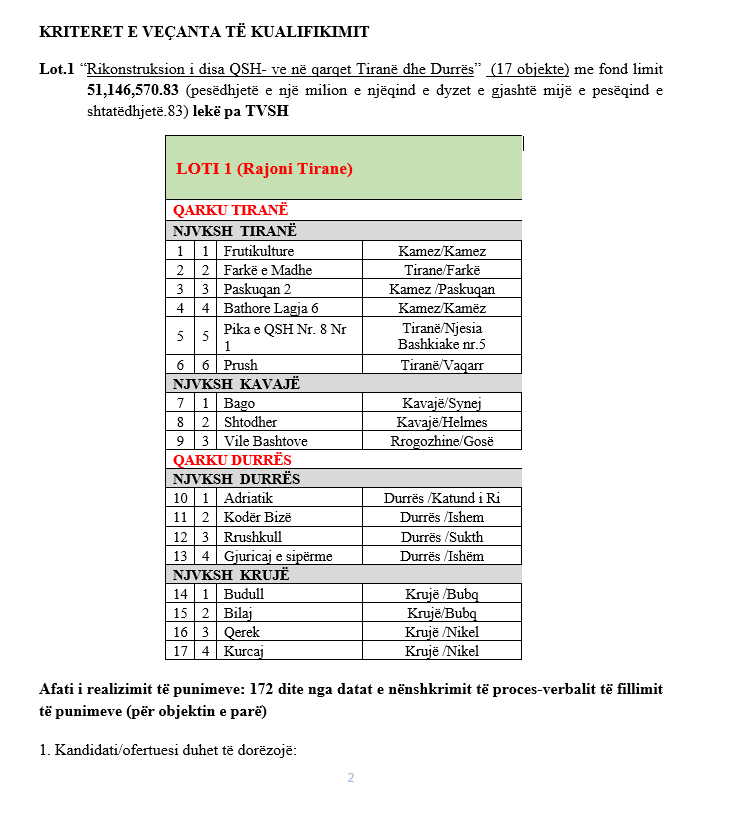 Ndërkohë, loti i dytë është me objekt “rikonstruksion i disa QSH-ve në qarqet Berat, Korçë dhe Elbasan”, ku janë 16 objekte me fond limit 63 milionë lekë. Kësaj here, në dokumente shkruhet se afati i realizimit të punimeve është për 180 ditë pas nënshkrimit të procesverbalit të fillimit të punimeve për objektin e parë.