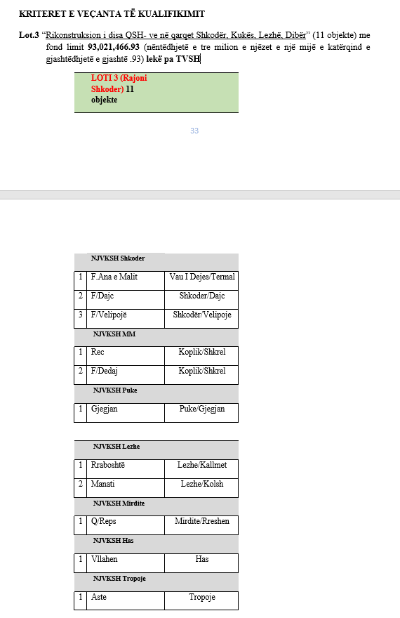 Loti i parë i këtij tenderi është “rikonstruksion i disa QSH-ve në qarqet Tiranë dhe Durrës”, teksa parashikohen të bëhen 17 objekte me fond 51 milionë lekë. Afati i realizimit të punimeve do të jetë për 172 ditë, ndërsa do të shtrihet në disa qytete dhe Njësi Administrative.