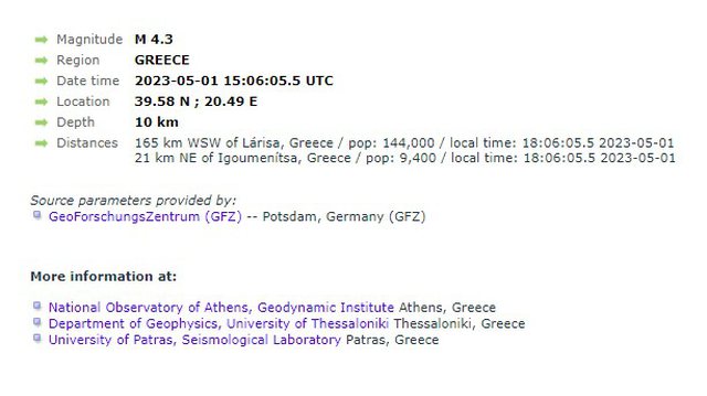 Sipas të dhënave të para, tërmeti ka pasur një thellësi rreth 10 kilometra dhe epiqendër rreth 20 kilometra larg Igumenicës.