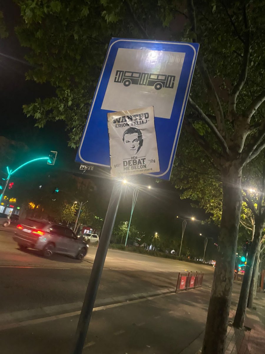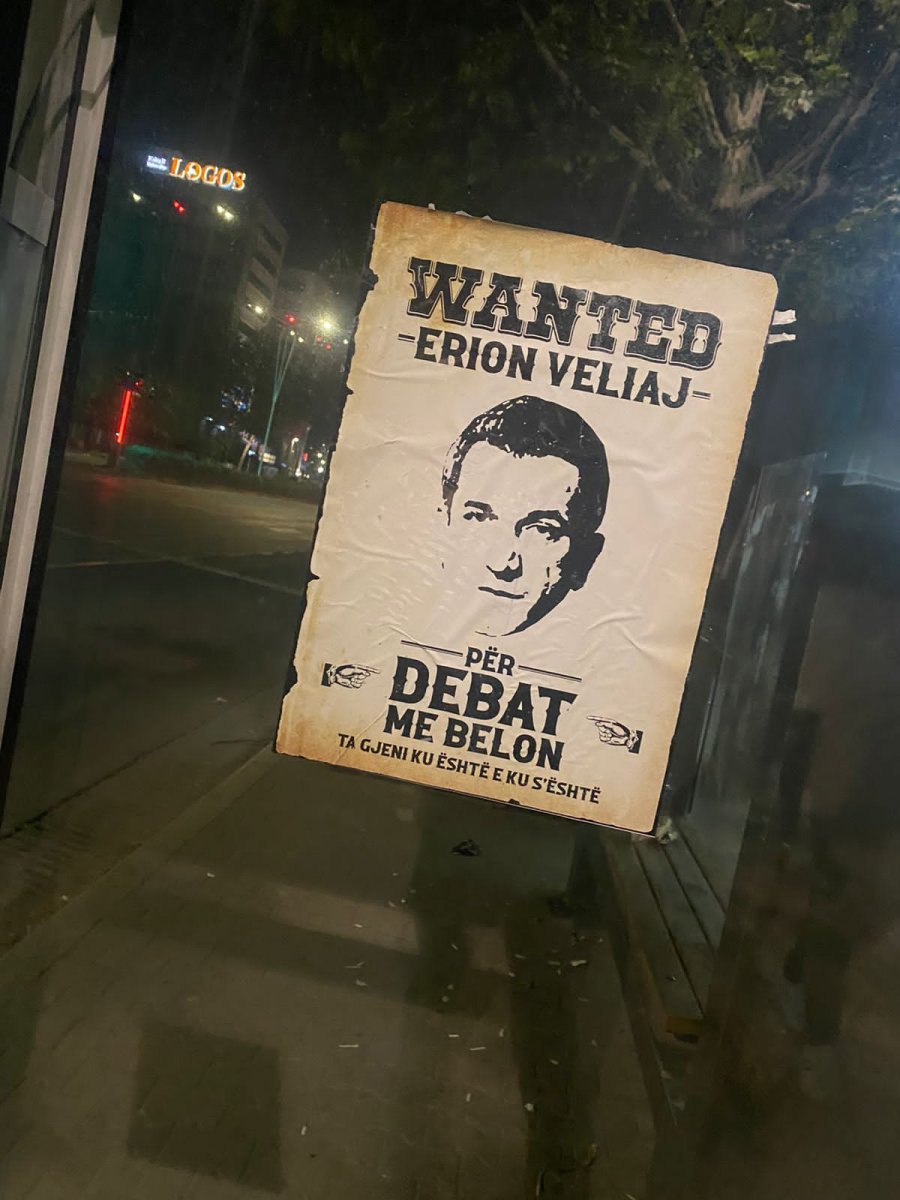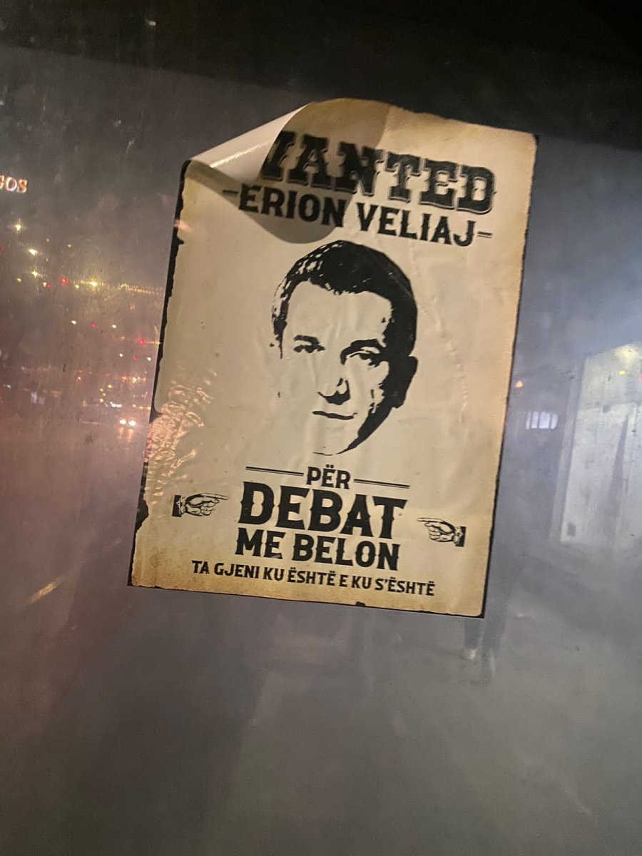 “Wanted Erion Veliaj për debat me Belon, ta gjeni ku është dhe ku s’është”, shkruhet në këto postera.