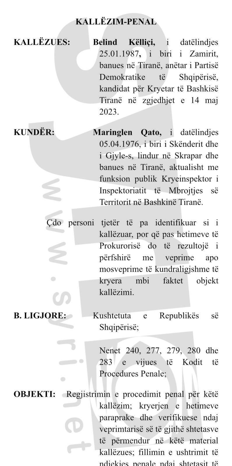 Dy javë pasi denoncoi publikisht skemën e punësimeve nepotike në bashkinë e Tiranës dhe atë të përfitimeve nëpërmjet tenderave e lejeve të ndërtimit, Belind Këlliçi ka paditur në Prokurorinë e Posaçme, kreun e Inspektoriatit Ndërtimor, Mariglen Qato.