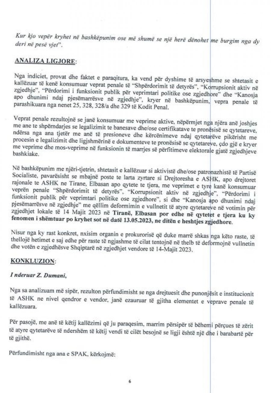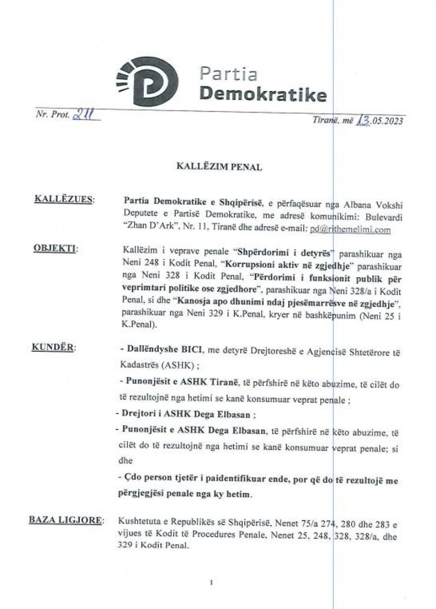 Partia Demokratike i bën thirrje SPAK për regjistrimin dhe fillimin e një procedimi penal ndaj personave të kallëzuar, si dhe kryerjen e të gjitha veprimeve hetimore dhe sqarim sa më të saktë të rrethanave më sipër.