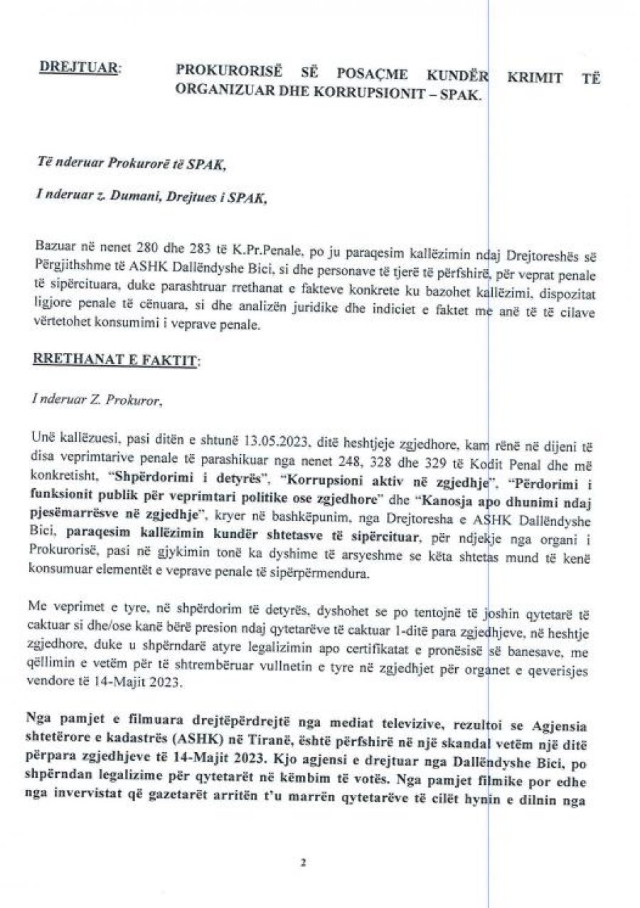 Partia Demokratike ka kallëzuar sot penalisht në SPAK, drejtoreshën e Agjencisë Shtetërore të Kadastrës (ASHK), Dallëndyshe Bici.