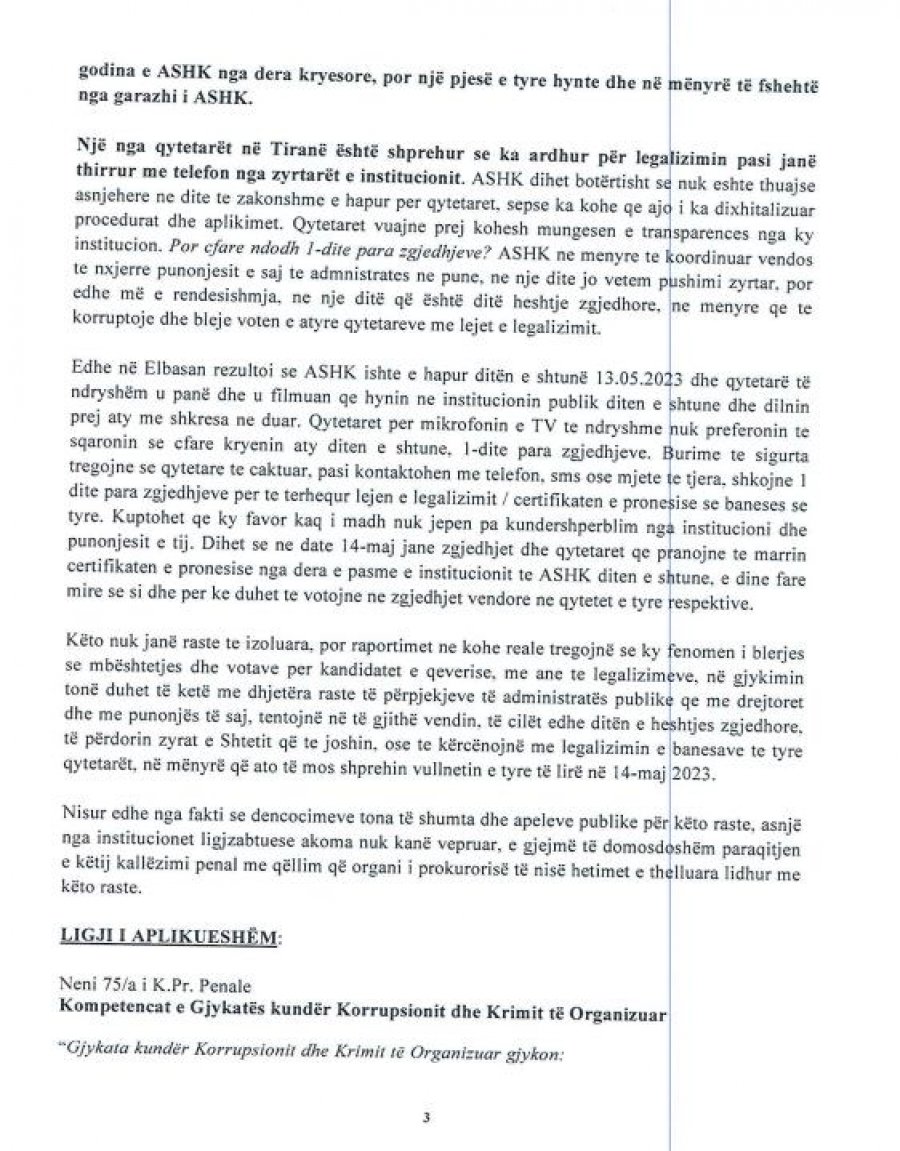 Nga pamjet e filmuara nëpërmjet mediave televizive, rezultoi se drejtoresha e ASHK në Tiranë përfshirë në një skandal, pikërisht një ditë para zgjedhjeve të 14 majit. Agjencia e drejtuar nga Dallëndyshe Bici po shpërndan për qytetarët legalizime në këmbim të votës.
