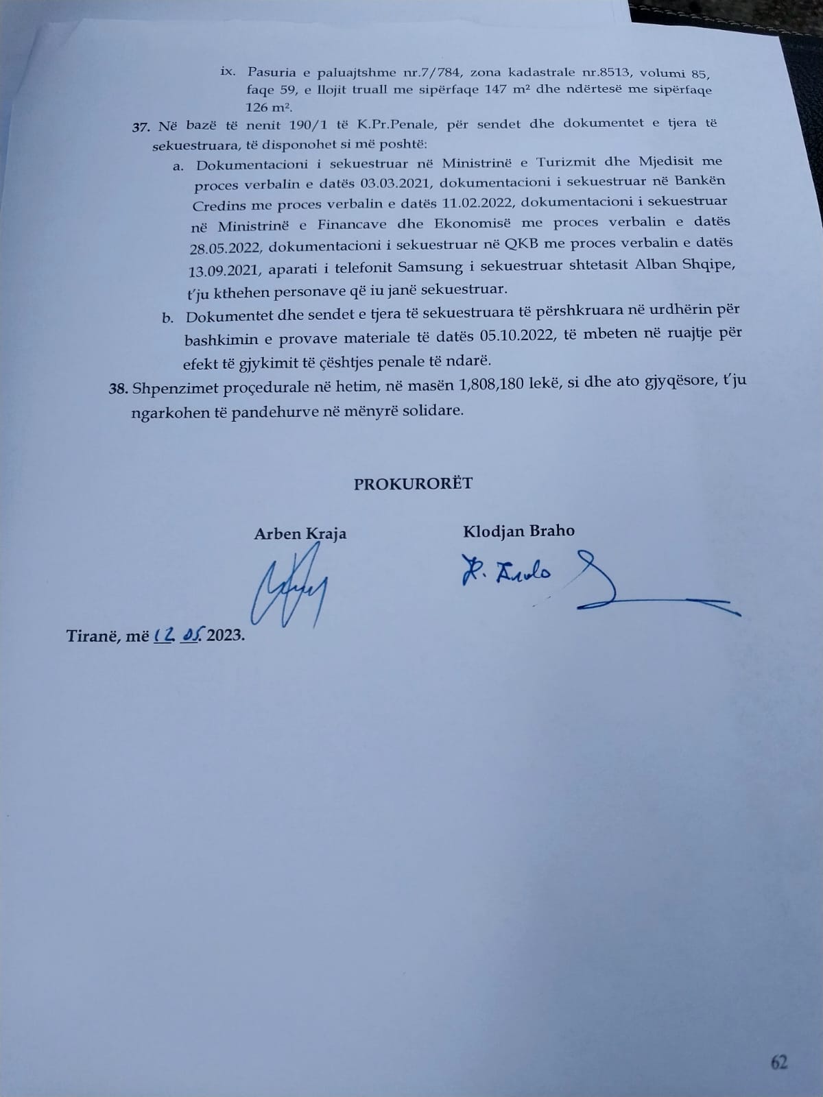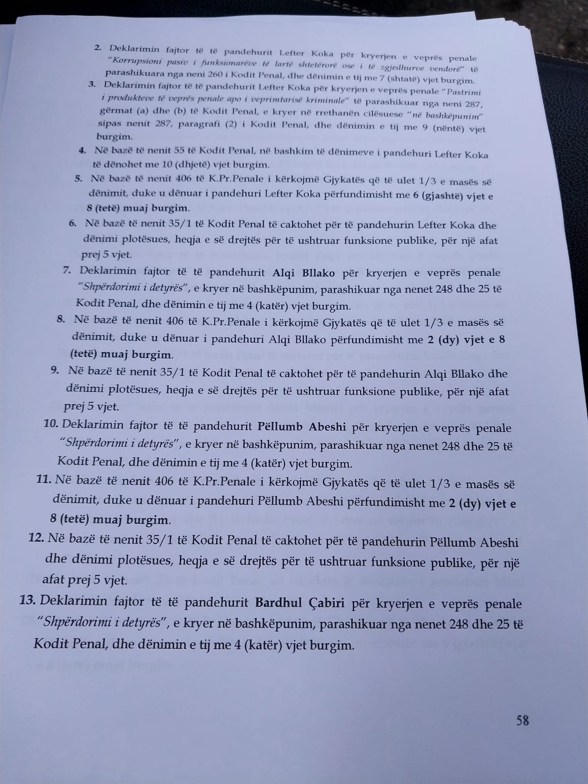 “Lidhur me këto dy momente, i pandehuri Lefter Koka në cilësinë e ish Ministrit të Mjedisit, i pandehuri Alqi Bllako në cilësinë e ish Sekretarit të Përgjithshëm në Ministrinë e Mjedisit, si dhe të pandehurit Pëllumb Abeshi, Bardhul Çabiri, Serafin Papa, Etleva Kondi dhe Jonida Zeqo, janë akuzuar se kanë kryer veprën penale “Shpërdorimi i detyrës”, të kryer në bashkëpunim, të parashikuar nga nenet 248 dhe 25 të Kodit Penal”, vijon njoftimi.